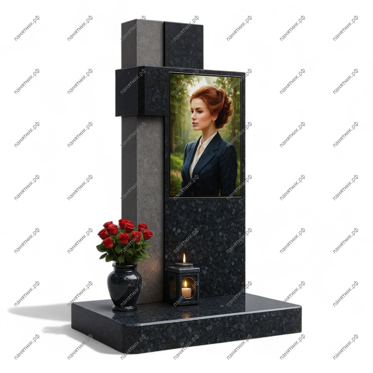 Мемориальный комплекс МК-269 — это авангардная композиция из двух видов гранита: глубокого синего и матового серого. Дизайн построен на пересечении геометрических объемов, образующих символическое начертание креста. Крупный портрет смещен в сторону, создавая динамичный и современный образ.
