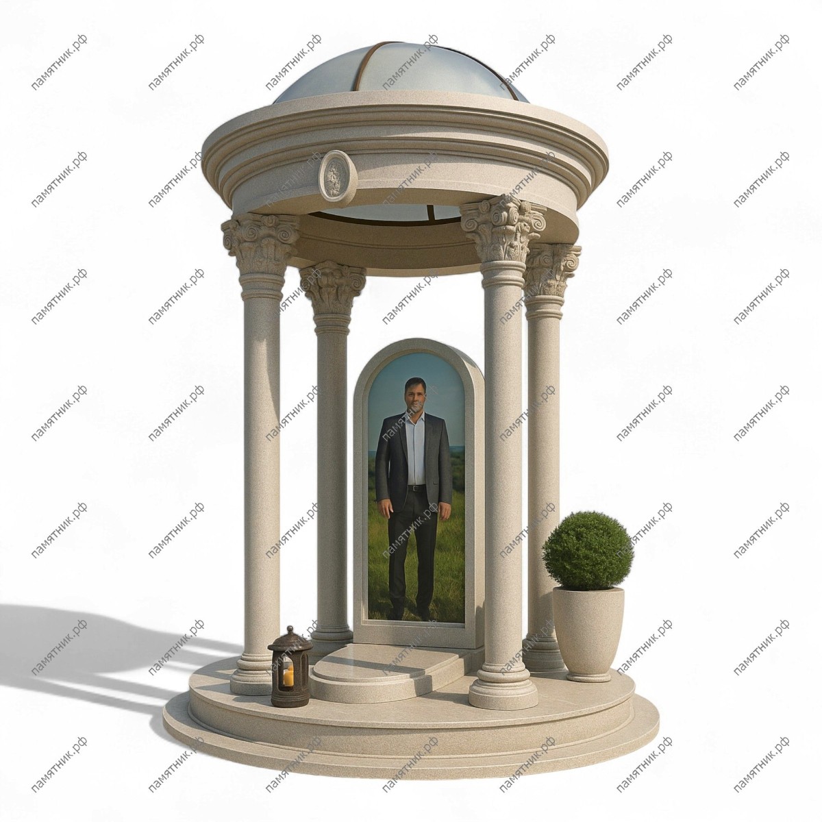 Мемориальный комплекс МК-27 — это изысканная круглая ротонда из светлого камня с купольной (возможно, стеклянной или прозрачной) крышей. Изящные резные капители колонн и светлые оттенки делают этот мемориал невероятно легким, возвышенным и утонченным.
