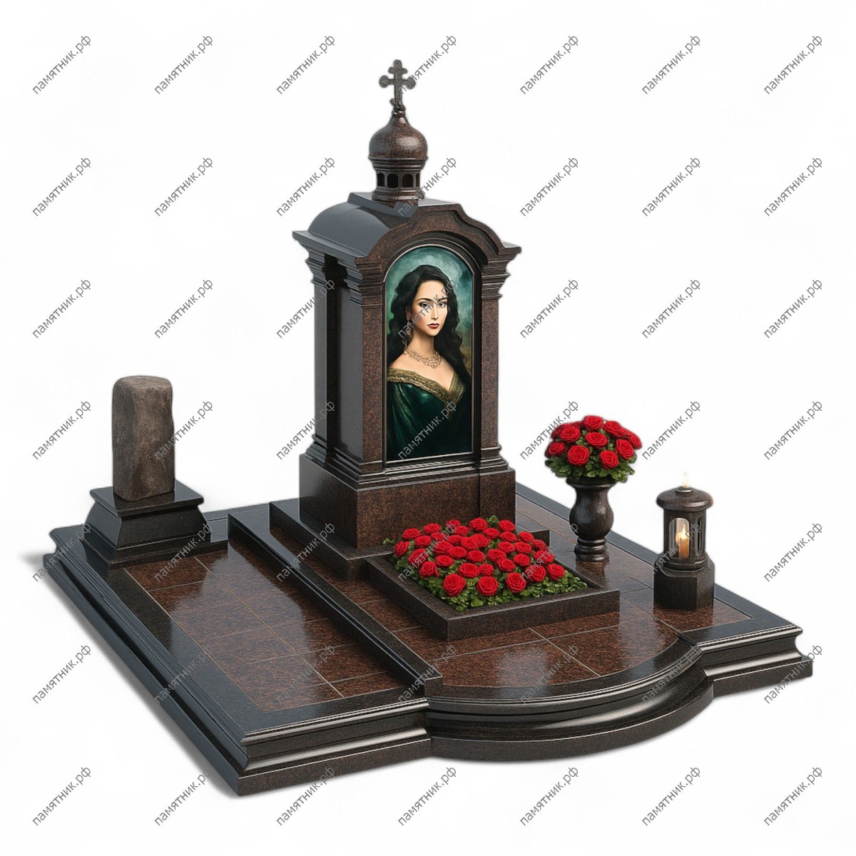 Мемориальный комплекс МК-271 — величественное сооружение в византийском стиле из темного гранита с красноватым отливом. Стела выполнена в форме часовни с изящным куполом, увенчанным крестом, и арочной нишей для портрета. Массивное многоуровневое основание подчеркивает монументальность и статусность захоронения.
