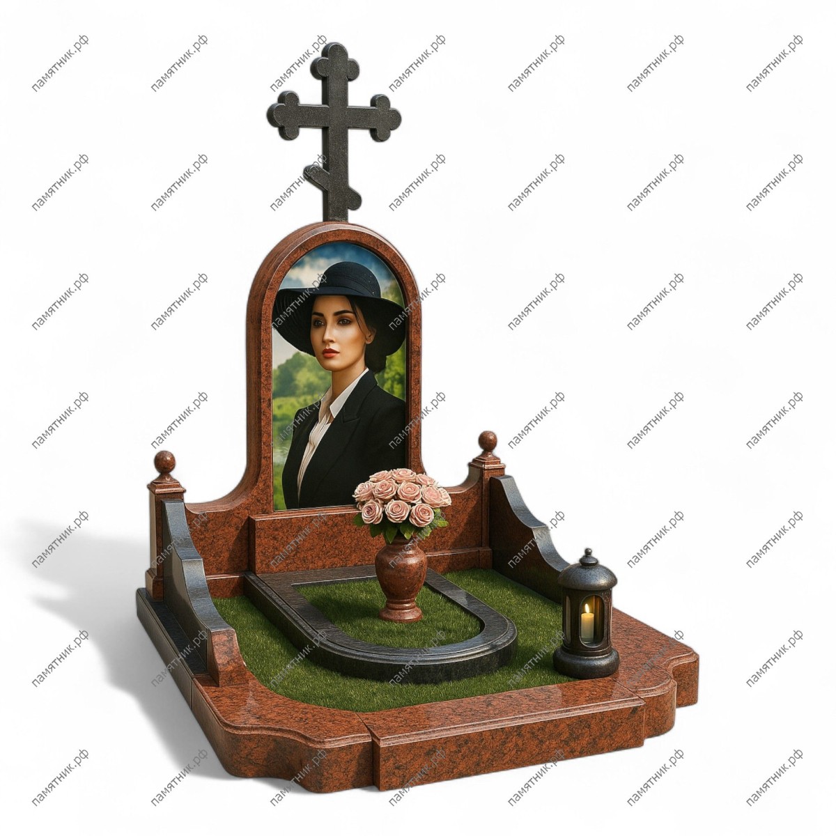 Мемориальный комплекс МК-280 выполнен в традиционном стиле из благородного красного гранита. Высокая арочная стела увенчана классическим православным крестом. Дизайн основания с невысокими бортиками и встроенным цветником создает уютное, уединенное пространство.