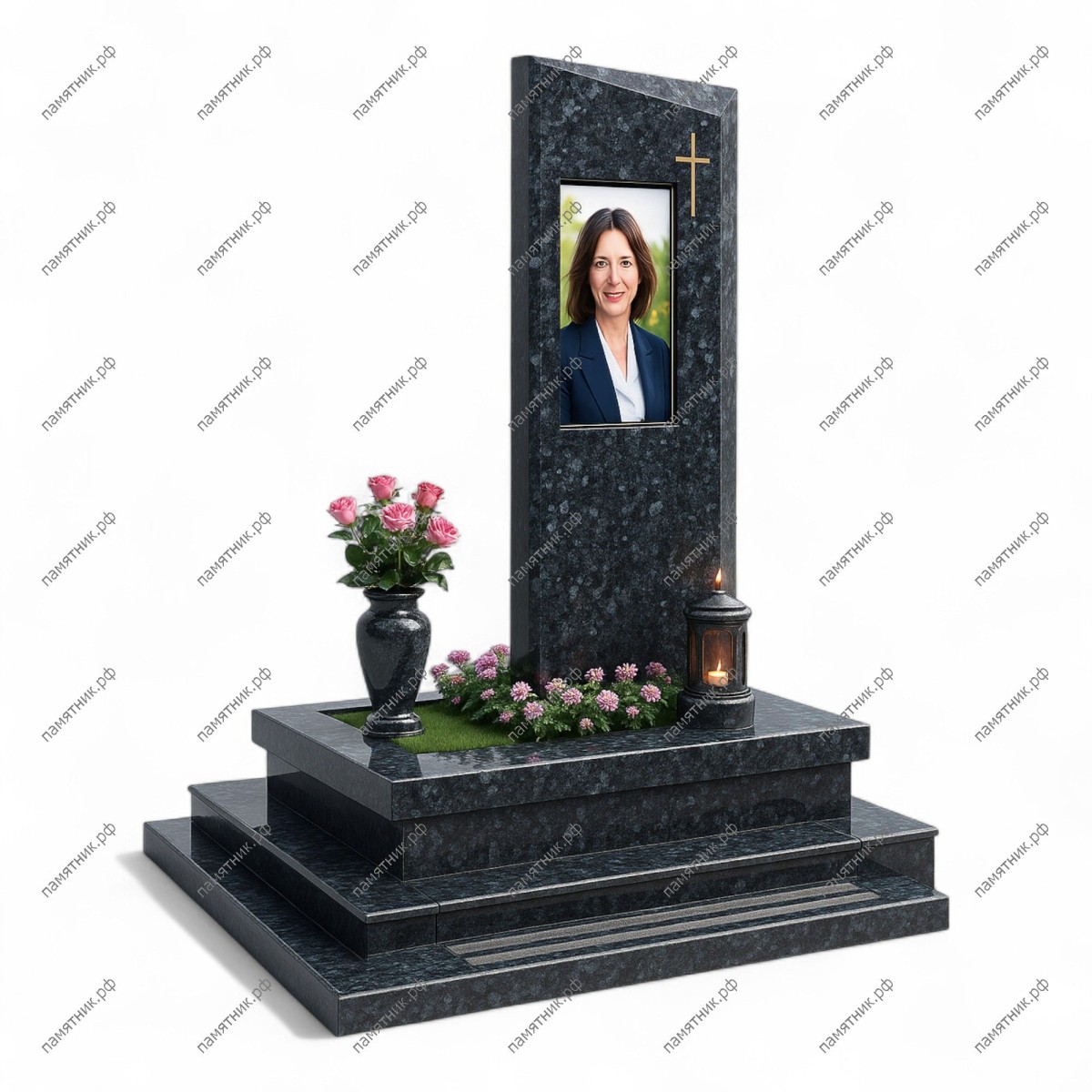 Мемориальный комплекс МК-285 отличается строгим минимализмом и использованием редкого камня с выраженной текстурой «лабрадорит». Высокая узкая стела со скошенным верхом дополнена золотым крестом и лаконичной вставкой портрета. Монументальность подчеркивается массивным трехъярусным основанием, создающим эффект возвышения.