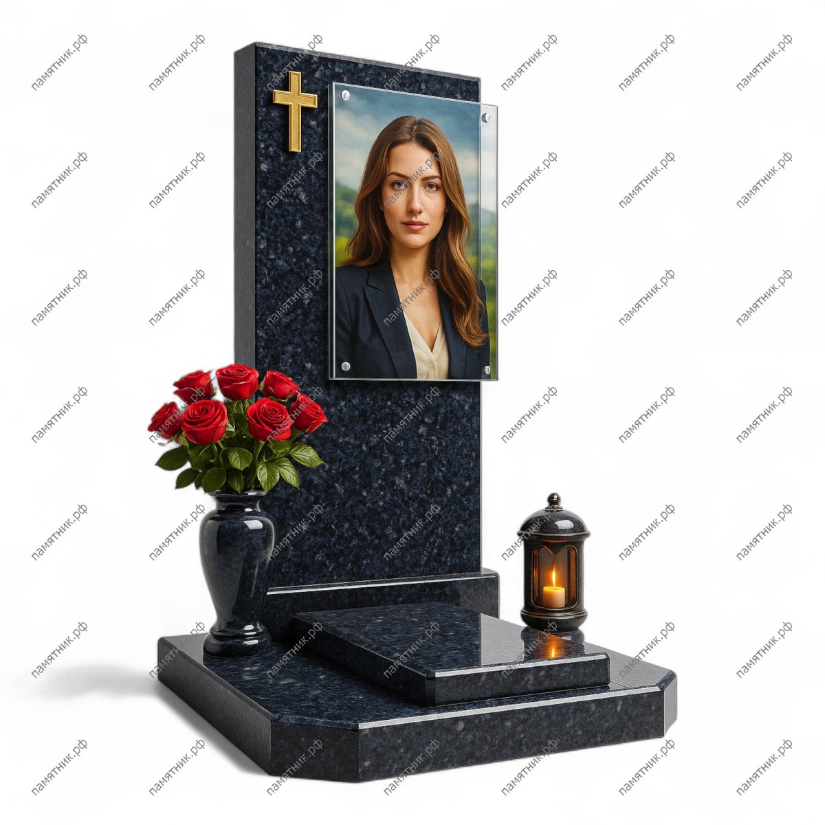 Мемориальный комплекс МК-292 привлекает внимание благородной текстурой темно-синего гранита и современным исполнением портретной зоны. Прямоугольная стела дополнена широкоформатным стеклянным полотном, закрепленным на декоративных болтах, и лаконичным золотым крестом. Массивное основание со скошенными углами подчеркивает надежность и монументальность конструкции.