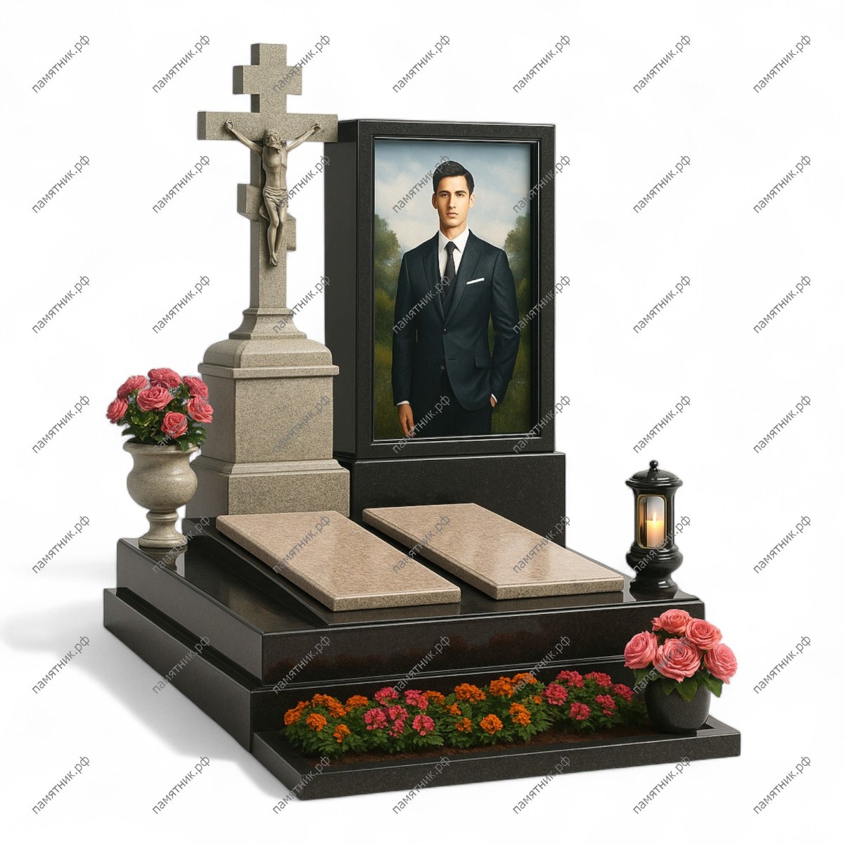 Мемориальный комплекс МК-295 — это строгий и масштабный монумент, построенный на сочетании двух видов камня. Портретная стела в виде массивного черного блока дополнена отдельно стоящим высоким распятием из серого гранита. Высокий двухъярусный подиум с двумя симметричными надгробными плитами подчеркивает статусность захоронения.