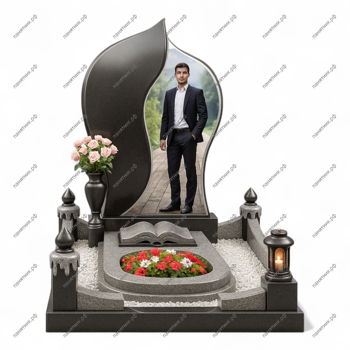 Мемориальный комплекс МК-302 — это художественная композиция с плавными, «пламенеющими» линиями. Асимметричная темная стела эффектно контрастирует со светлой каменной крошкой в основании. На надгробной плите расположена детально проработанная скульптура раскрытой книги, символизирующая вечную память и историю жизни.