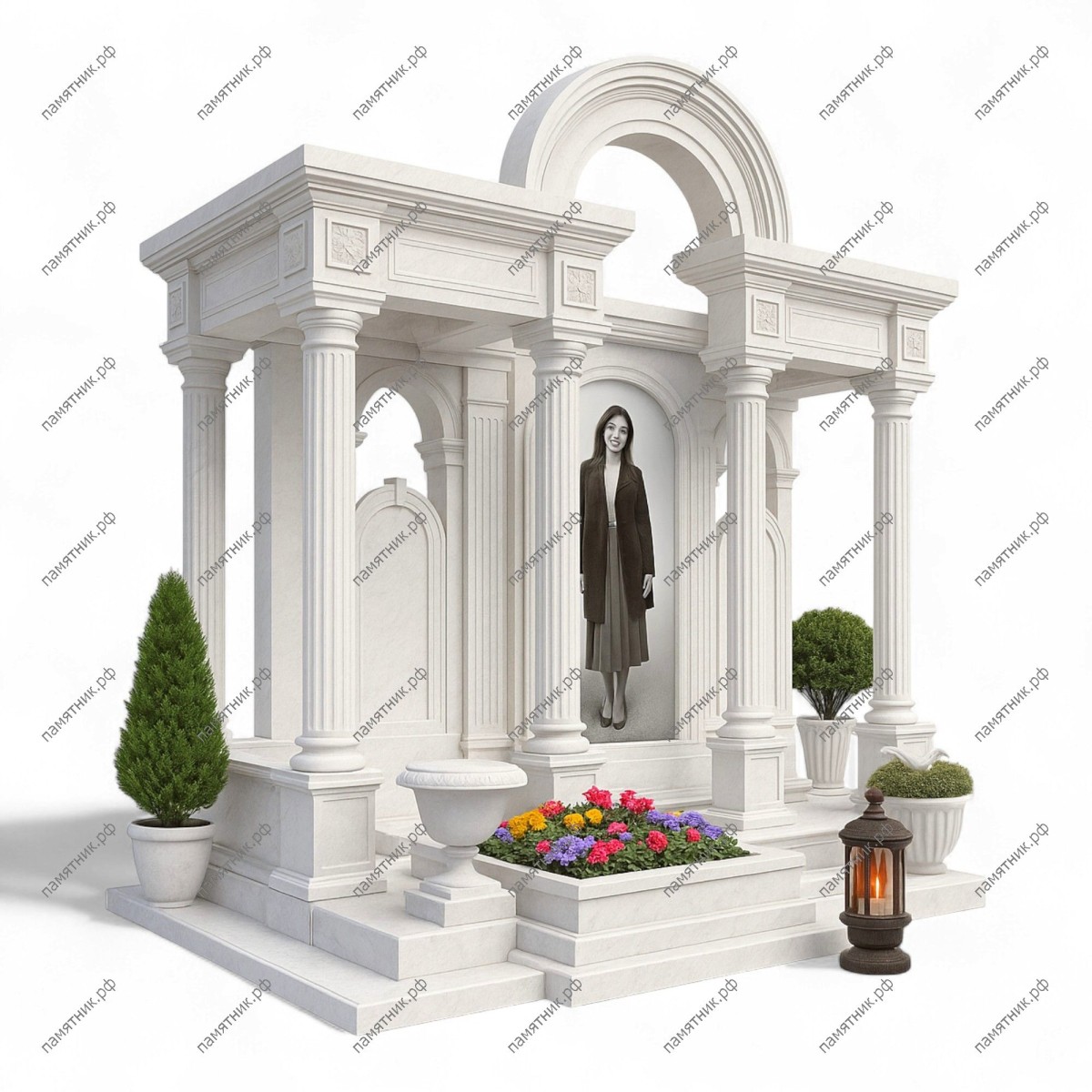 Мемориальный комплекс МК-31 — это светлый и величественный памятник в виде открытого павильона-часовни из белоснежного камня. Сложная многоуровневая архитектура с арками и классическими колоннами создает ощущение легкости, возвышенности и торжественного покоя. Центральная ниша образует защищенное пространство для портрета.