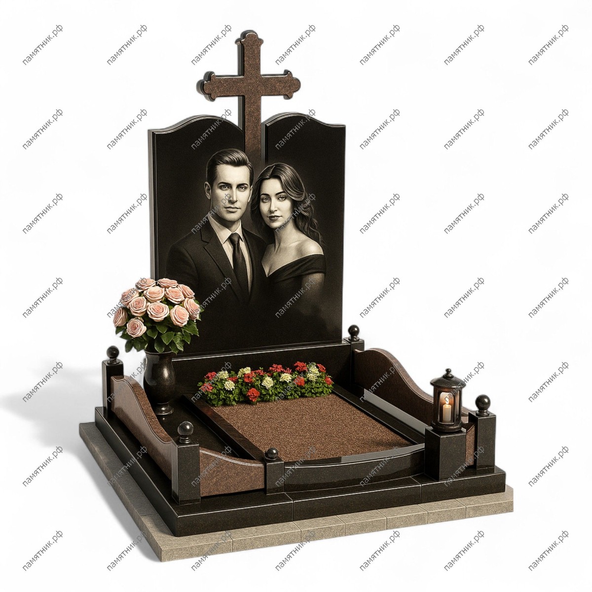 Мемориальный комплекс МК-311 — это величественный семейный монумент из черного гранита, предназначенный для парного захоронения. Стела имеет классический силуэт с волнообразным верхом, за которым возвышается массивный православный крест из контрастного коричневого камня. Фигурное ограждение с массивными столбиками и шарами придает участку завершенный и защищенный вид.