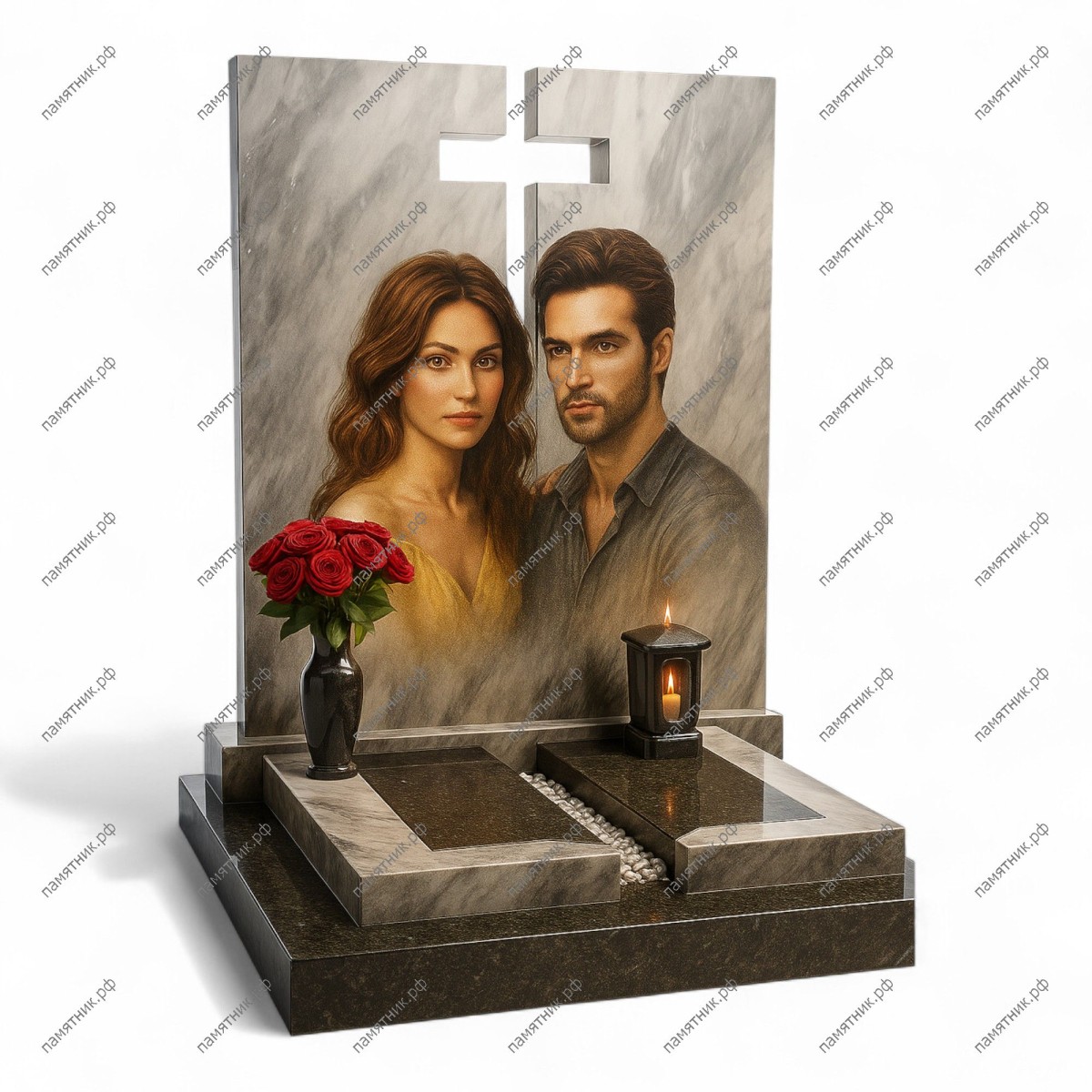 Мемориальный комплекс МК-313 представляет собой монументальную плиту из светлого камня с уникальной фактурой, имитирующей мраморные разводы. В центре стелы выполнен сквозной вырез в форме креста, который наполняет композицию светом и легкостью. Реалистичный портрет, выполненный в технике художественной гравировки, занимает значительную часть поверхности.