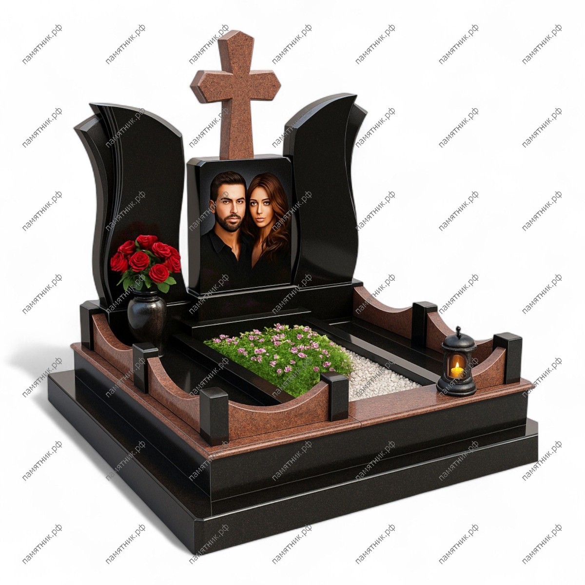Мемориальный комплекс МК-314 — это симметричная композиция в стиле «триптих», выполненная из черного полированного камня. Центральный блок с портретом и красным крестом обрамлен двумя изогнутыми стелами-крыльями. Плавные линии ограждения и контрастная отсыпка цветника подчеркивают торжественность монумента.