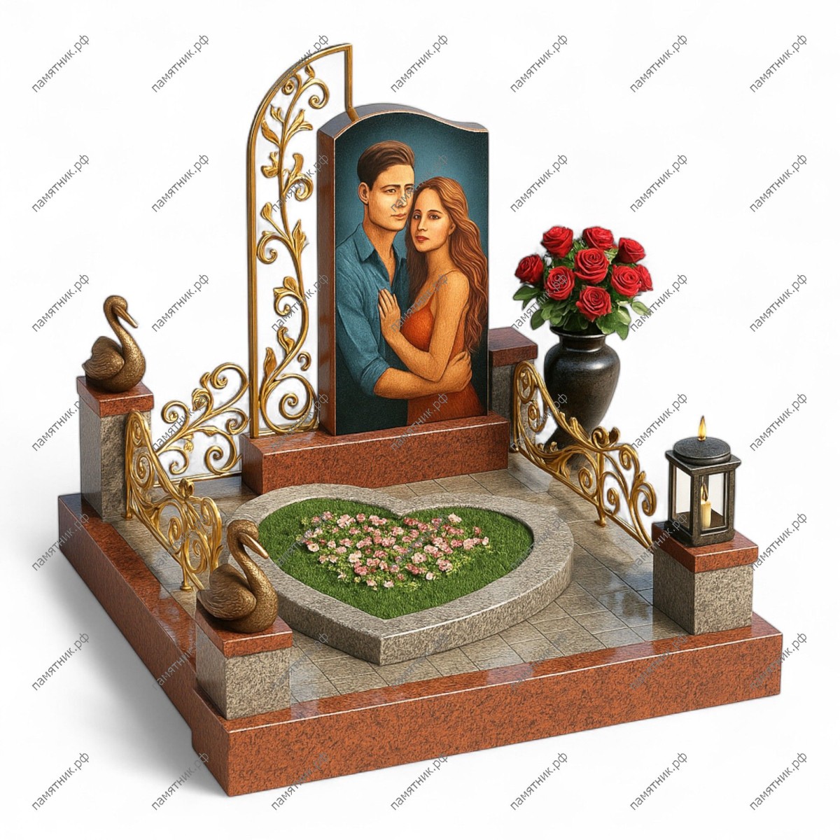 Мемориальный комплекс МК-315 — это высокохудожественная работа, насыщенная символикой любви и верности. Стела дополнена золоченой металлической решеткой с растительным орнаментом, а в основании расположен цветник в форме сердца. Скульптуры двух лебедей на столбиках ограждения венчают этот трогательный образ.