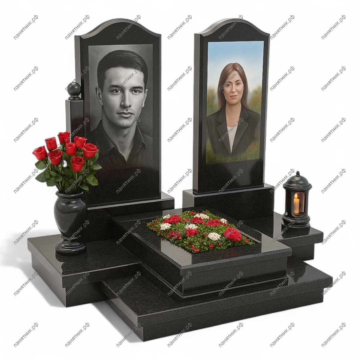 Мемориальный комплекс МК-317 представляет собой строгий и лаконичный ансамбль из черного гранита. Две прямоугольные стелы разной высоты создают динамичный, но сдержанный силуэт. Многоступенчатый пьедестал с центральным возвышением для цветника придает конструкции архитектурную глубину.