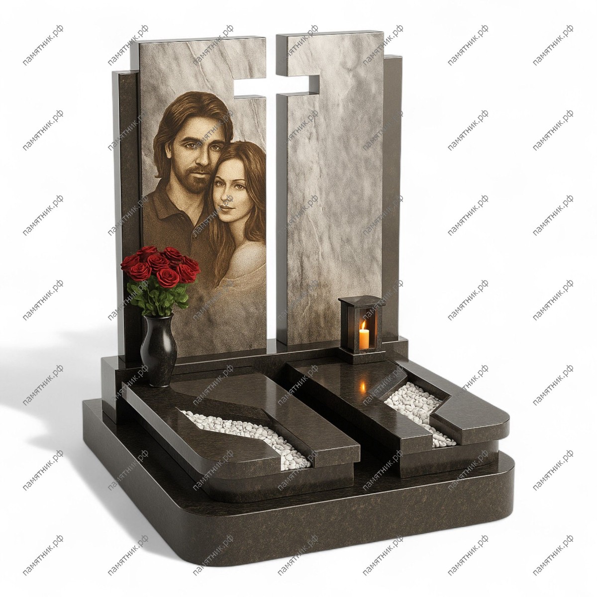 Мемориальный комплекс МК-319 — это вариация монолитного памятника со сквозным символом. Портрет пары нанесен на текстурированный серый камень, в котором вырезан строгий крест. Подиум имеет сложную форму с углублениями, заполненными белой мраморной галькой, что создает эффект чистоты и света.