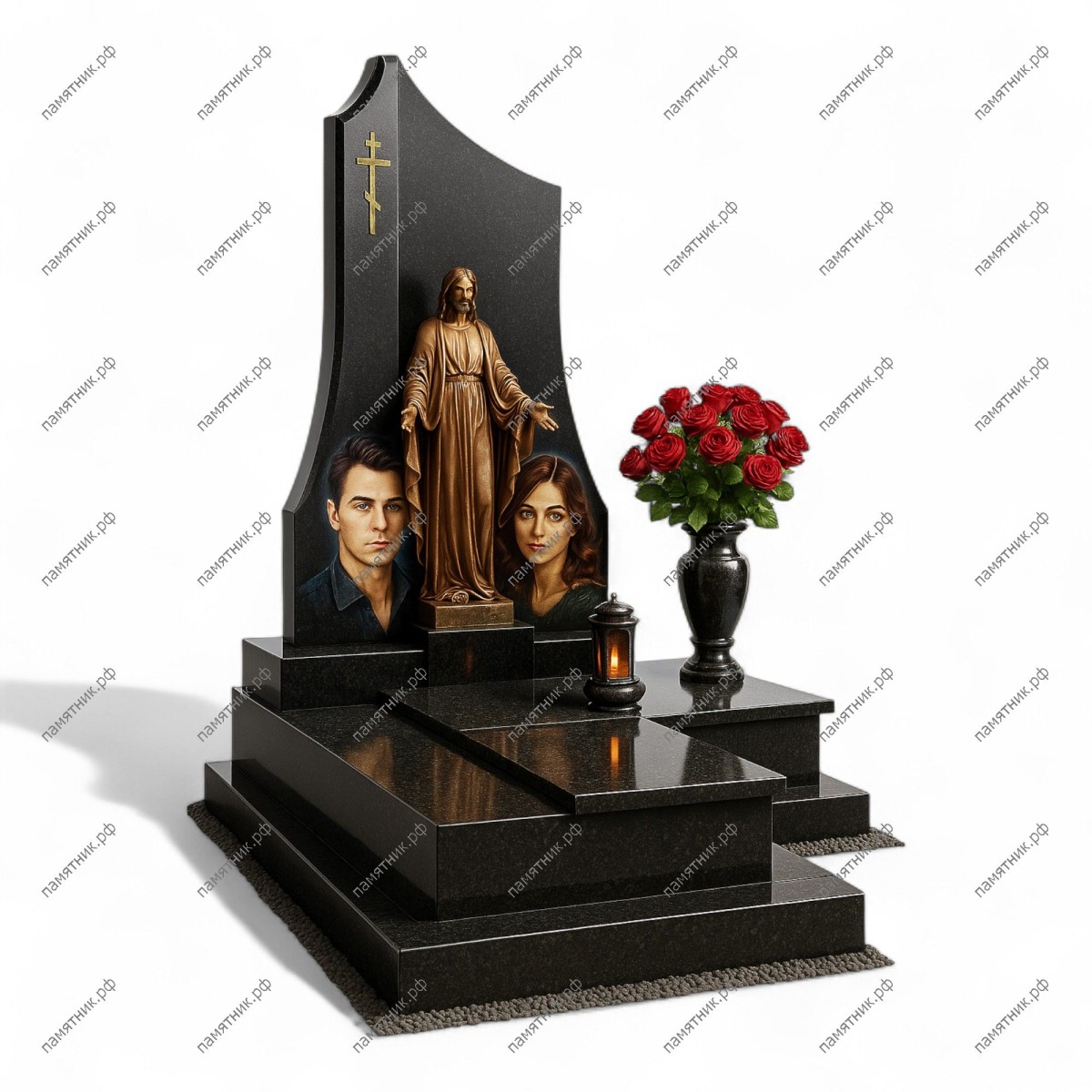 Мемориальный комплекс МК-321 — это величественная монументальная композиция из черного полированного гранита. Центральным элементом является высокая стела со скошенным верхом, дополненная золотистой скульптурой Иисуса Христа и лаконичным крестом. Массивный многоярусный подиум подчеркивает торжественность и значимость мемориала.