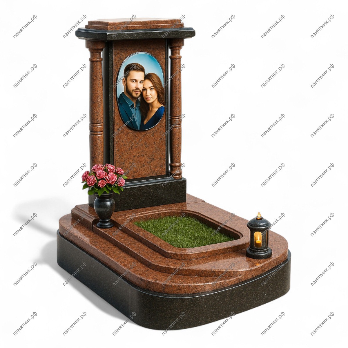 Мемориальный комплекс МК-323 — это благородное сочетание насыщенного коричневого гранита и классических архитектурных форм. Стела-портал с круглыми колоннами обрамляет овальный медальон с портретом, установленный на фоне текстурированного камня. Широкое скругленное основание со ступенями придает комплексу мягкость и законченность.