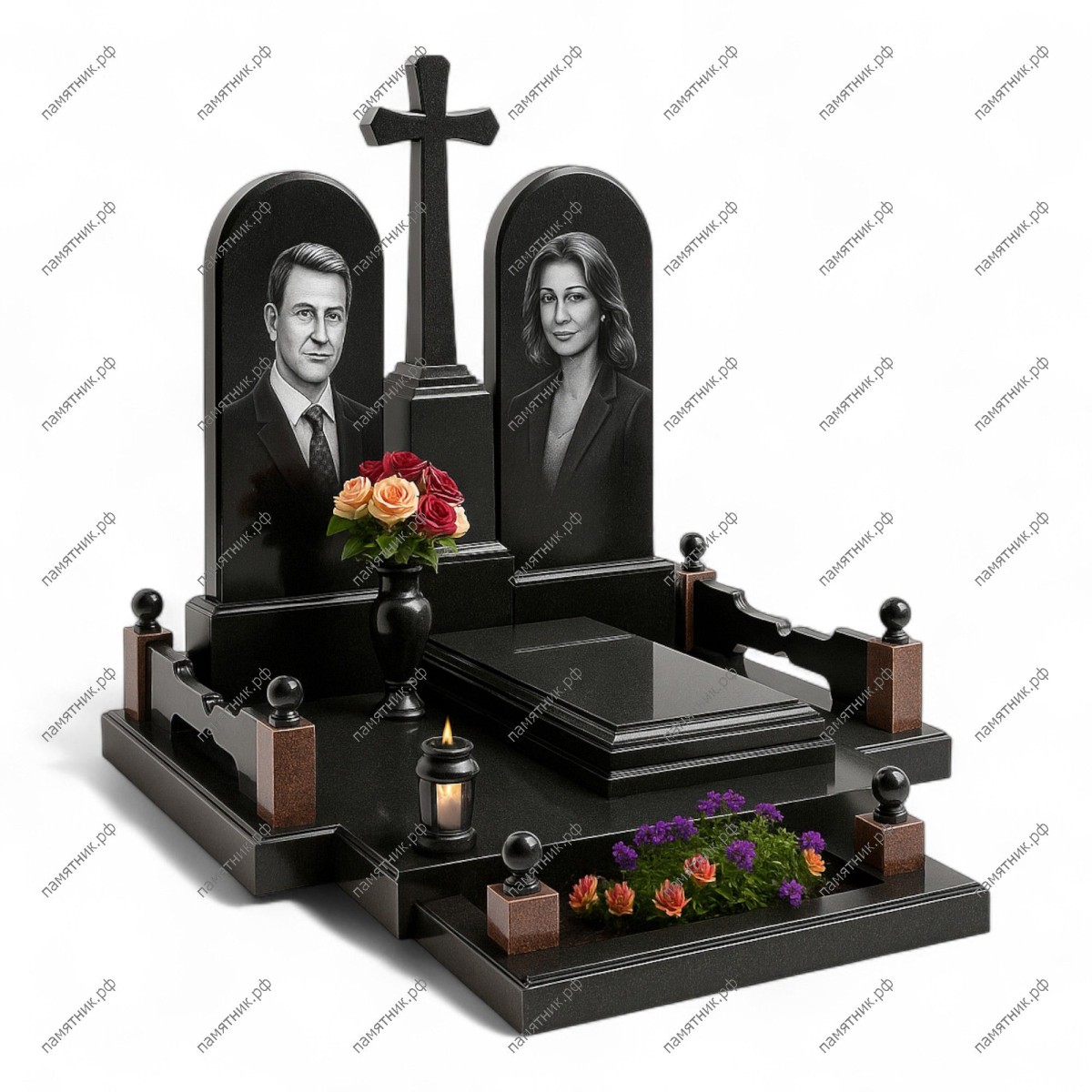 Мемориальный комплекс МК-327 — это симметричный ансамбль для семейного захоронения. Две идентичные арочные стелы разделены центральным постаментом с массивным четырехконечным крестом. Дизайн дополнен сложным ограждением с коричневыми вставками, создающим единый архитектурный стиль.