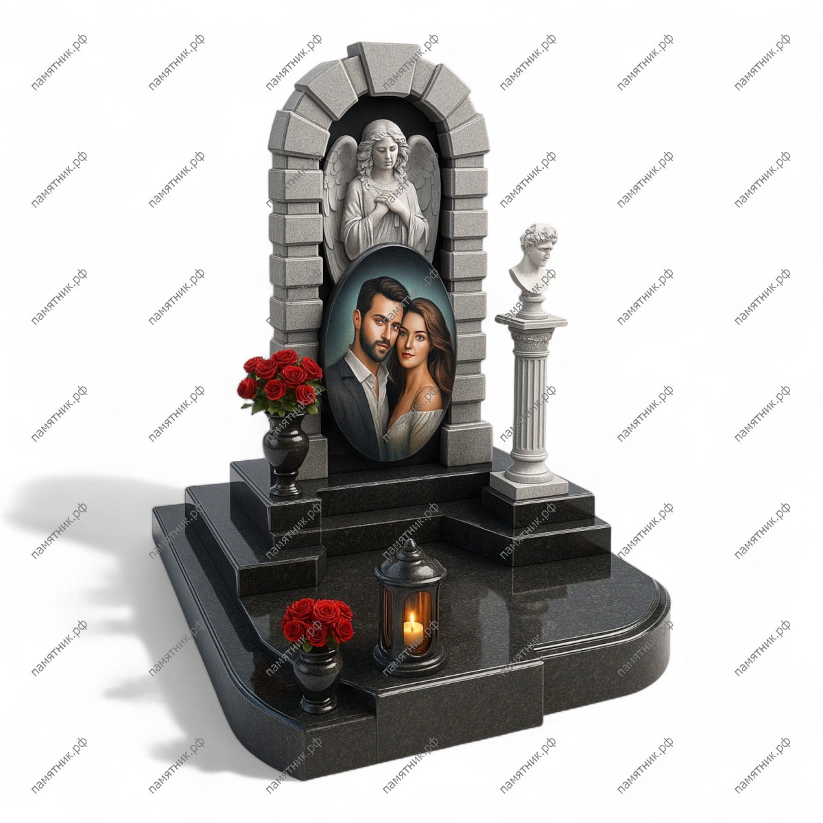 Мемориальный комплекс МК-329 — это сложная художественная инсталляция, вдохновленная классической античной архитектурой. Композиция включает в себя серую каменную арку со скульптурой ангела, овальный портрет и изящную колонну с бюстом. Скругленный передний край подиума придает комплексу особую эстетику.