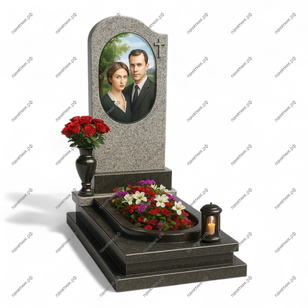 Мемориальный комплекс МК-331 представляет собой гармоничное сочетание светлого и темного камня. Центральная стела из светло-серого мелкозернистого гранита украшена овальным портретом и лаконичной гравировкой креста. Особенностью модели является массивный ступенчатый подиум, в центре которого расположен изящный овальный цветник, создающий эффект многослойности.