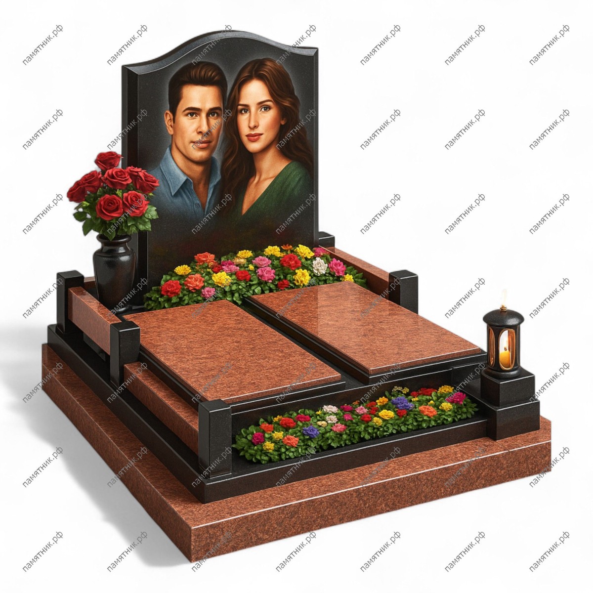 Мемориальный комплекс МК-332 — это масштабная семейная композиция, выполненная в теплых красно-коричневых тонах. Широкая горизонтальная стела из черного гранита предназначена для парного портрета, а ее строгость смягчается обилием зелени и цветов в интегрированных цветниках. Две массивные горизонтальные плиты на подиуме подчеркивают основательность и долговечность мемориала.