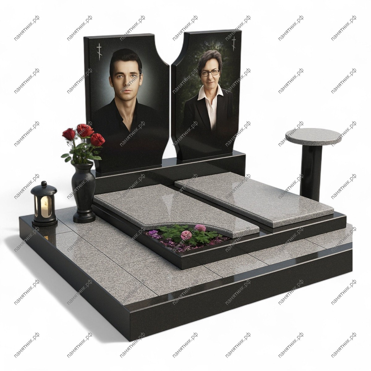 Мемориальный комплекс МК-335 представляет собой ансамбль из двух автономных стел с изящными закругленными вершинами, объединенных общей платформой. Большая часть подиума закрыта светлыми гранитными плитами, что обеспечивает чистоту и долговечность участка. Наличие отдельного ритуального столика делает комплекс функциональным и завершенным.