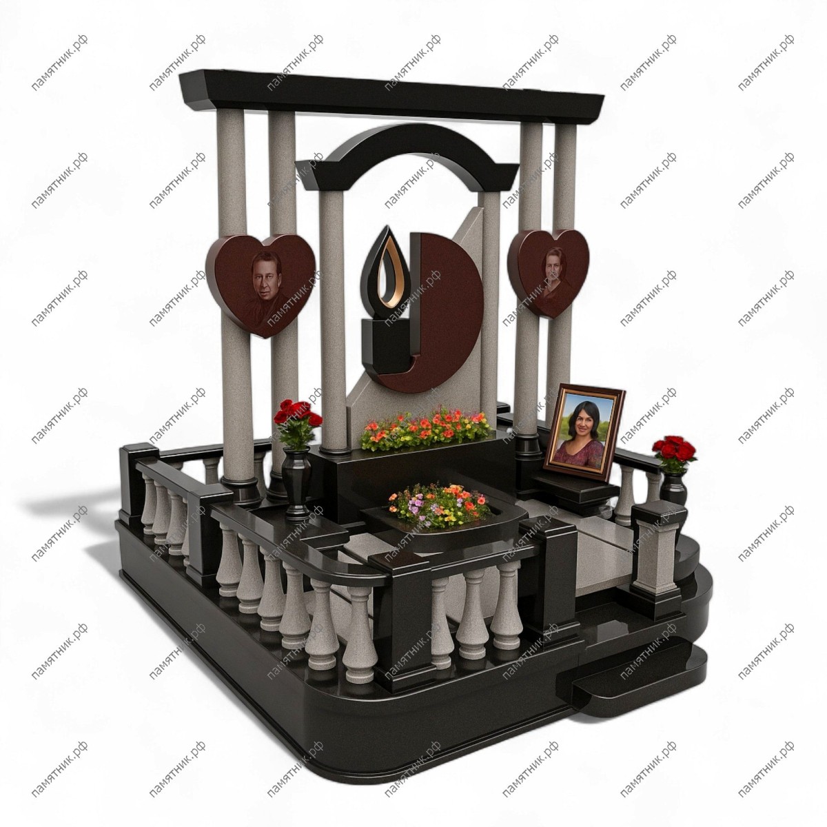 Описание: Сложная многоуровневая композиция, наполненная глубоким символизмом. Центральная часть состоит из арки и стелы с резным изображением пламени свечи. По бокам на светлых колоннах закреплены два красных гранитных сердца с портретами.