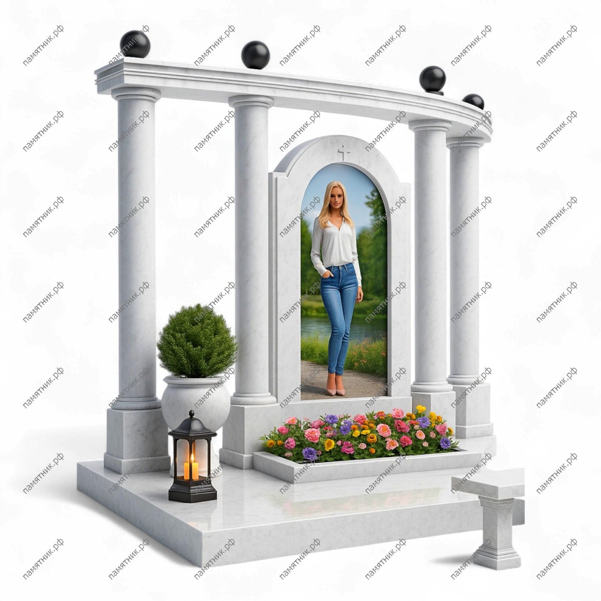 Мемориальный комплекс МК-44 выделяется светлым, лаконичным, но монументальным дизайном. Прямая колоннада увенчана строгим карнизом, который декорирован контрастными черными шарами. Центральная арочная стела с высеченным крестом гармонично вписывается в общую композицию, создавая ощущение чистоты и покоя.