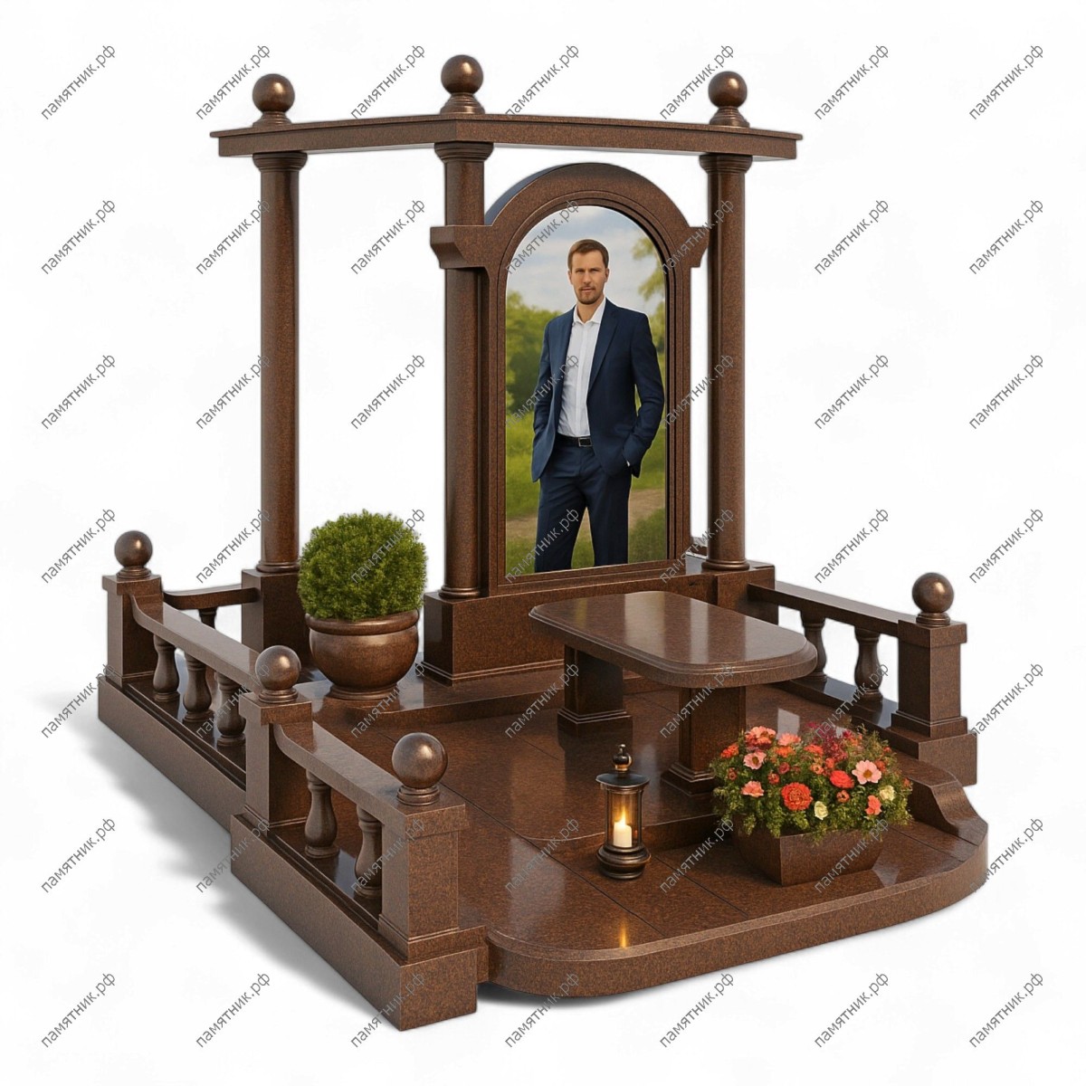 Мемориальный комплекс МК-59 выполнен из благородного коричневого гранита. В этом мемориале акцент сделан на просторную и удобную зону для поминовения: перед изящной арочной стелой с навесом установлены массивный гранитный стол и широкая скамья. Классическая балюстрада завершает композицию.