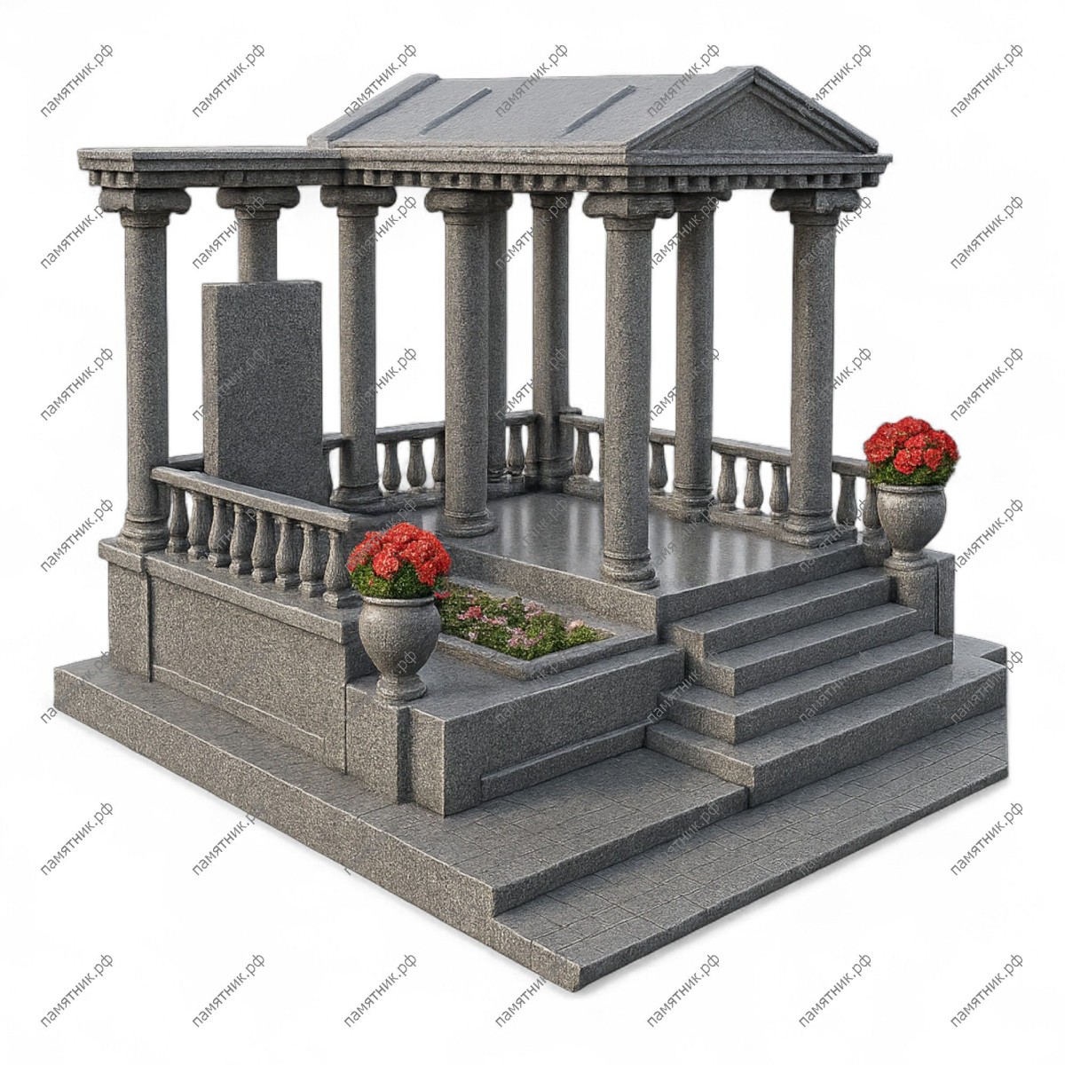 Особенности: Комплекс установлен на высоком подиуме, к которому ведет лестница. По периметру павильона проходит гранитная балюстрада. В конструкцию ступеней органично вписан прямоугольный цветник и две вазы.