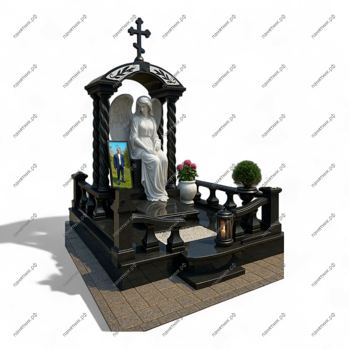 Мемориальный комплекс МК-61 — это высокохудожественная композиция из черного полированного гранита, привлекающая внимание изящными витыми (соломоновыми) колоннами. Внутри арочного свода, украшенного тонким светлым орнаментом и крестом, безмолвно восседает прекрасная белоснежная скульптура ангела, создающая пронзительный контраст с темным камнем.