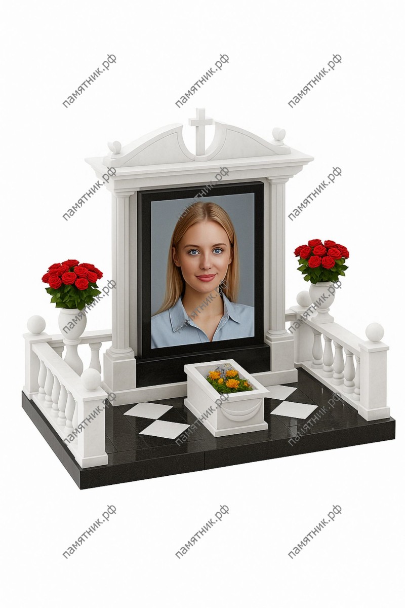 Мемориальный комплекс МК-62 построен на эффектном и торжественном контрасте белого мрамора и глубокого черного гранита. Центральный портрет обрамлен светлым классическим порталом с треугольным фронтоном. Особую эстетику комплексу придает мощеный пол с декоративными белыми ромбами и миниатюрный цветник в форме саркофага.