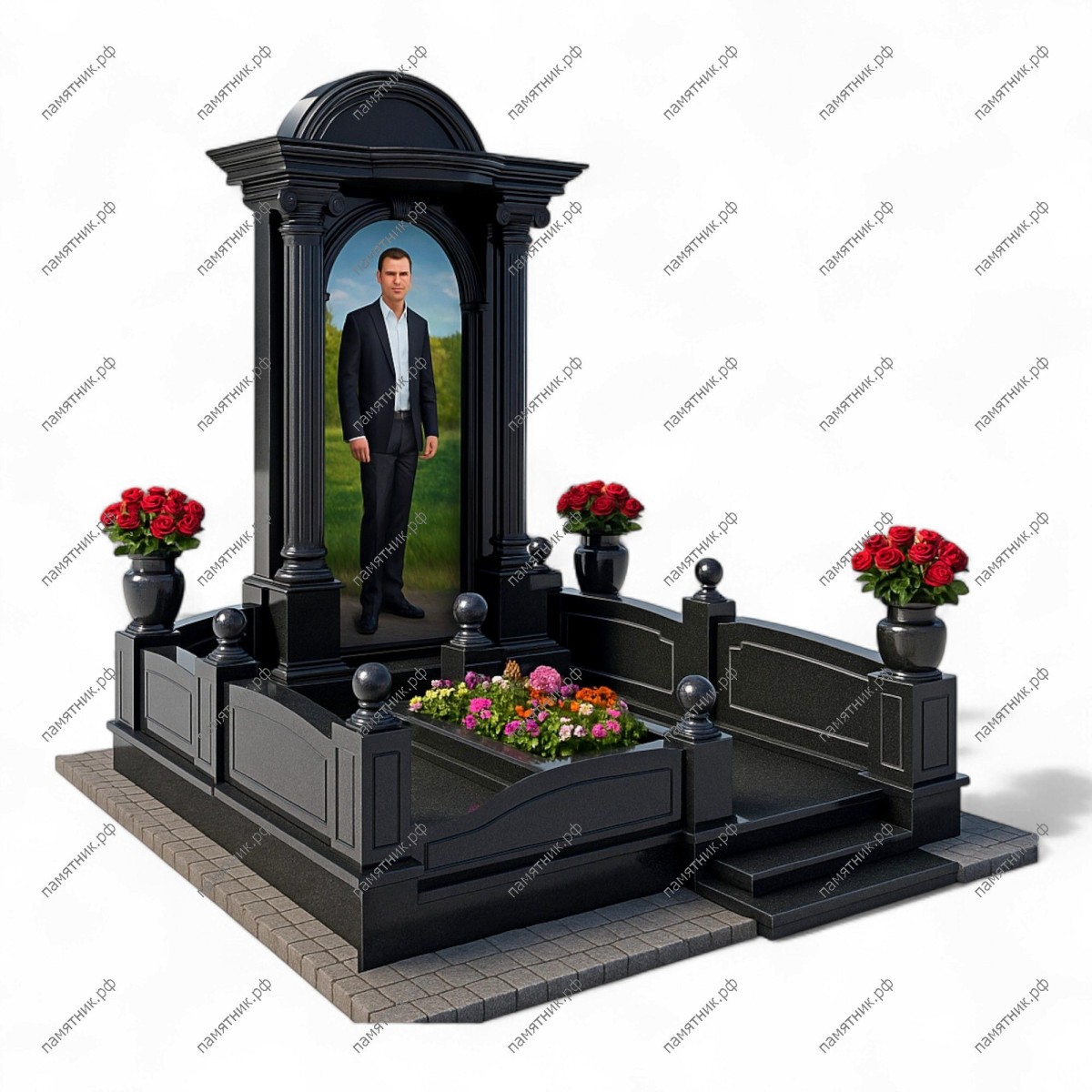 Мемориальный комплекс МК-69 — образец безупречной элегантности, полностью выполненный из черного полированного гранита. Глубокий монохромный цвет подчеркивает сложную архитектуру карниза и классических пилястр. Глухая фигурная ограда с круглыми навершиями создает атмосферу защищенности и уединения.