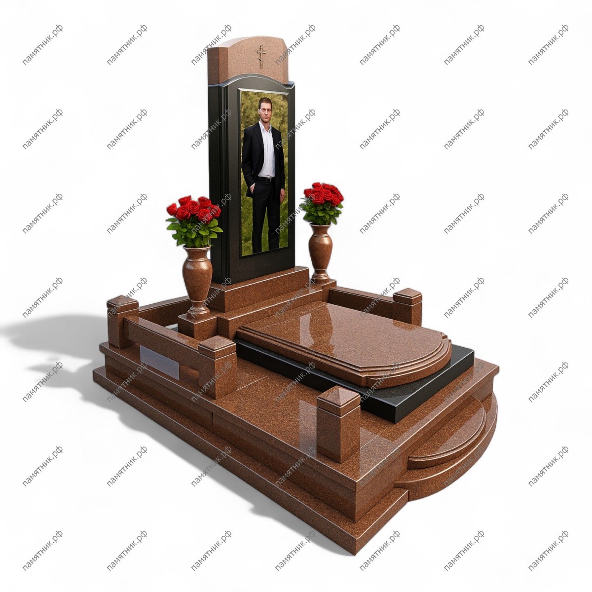 Мемориальный комплекс МК-70 выделяется благородным красно-коричневым оттенком и массивными, округлыми формами надгробной плиты. Центральная стела имеет лаконичный закругленный верх с высеченным крестом, а контрастная черная вставка акцентирует внимание на светлом портрете.