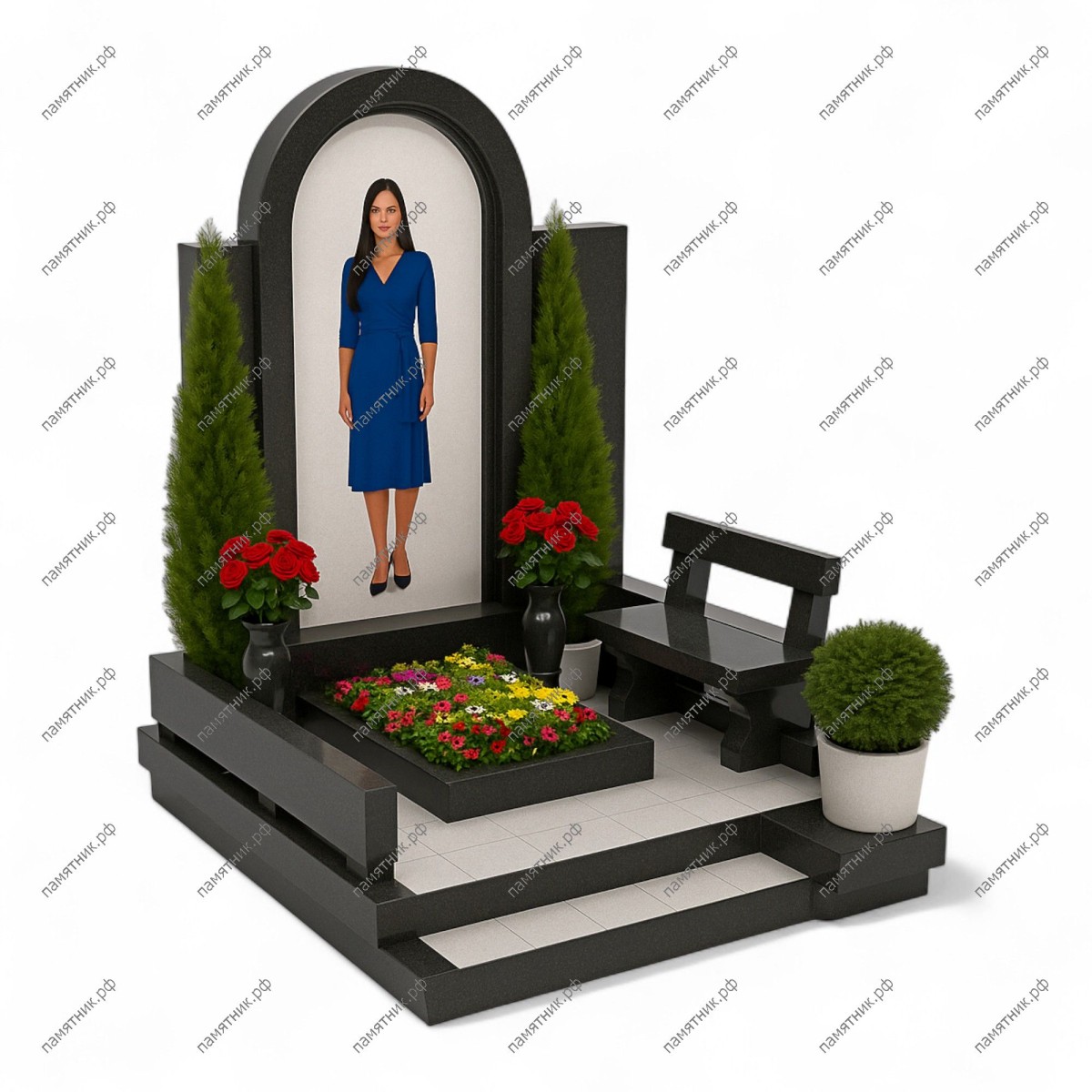 Мемориальный комплекс МК-72 — образец современного лаконичного дизайна в классическом черном цвете. Высокая арочная стела идеально подходит для размещения полноростового портрета. Просторная площадка и встроенная гранитная скамья со спинкой создают комфортное и эстетичное пространство для уединения и светлой памяти.