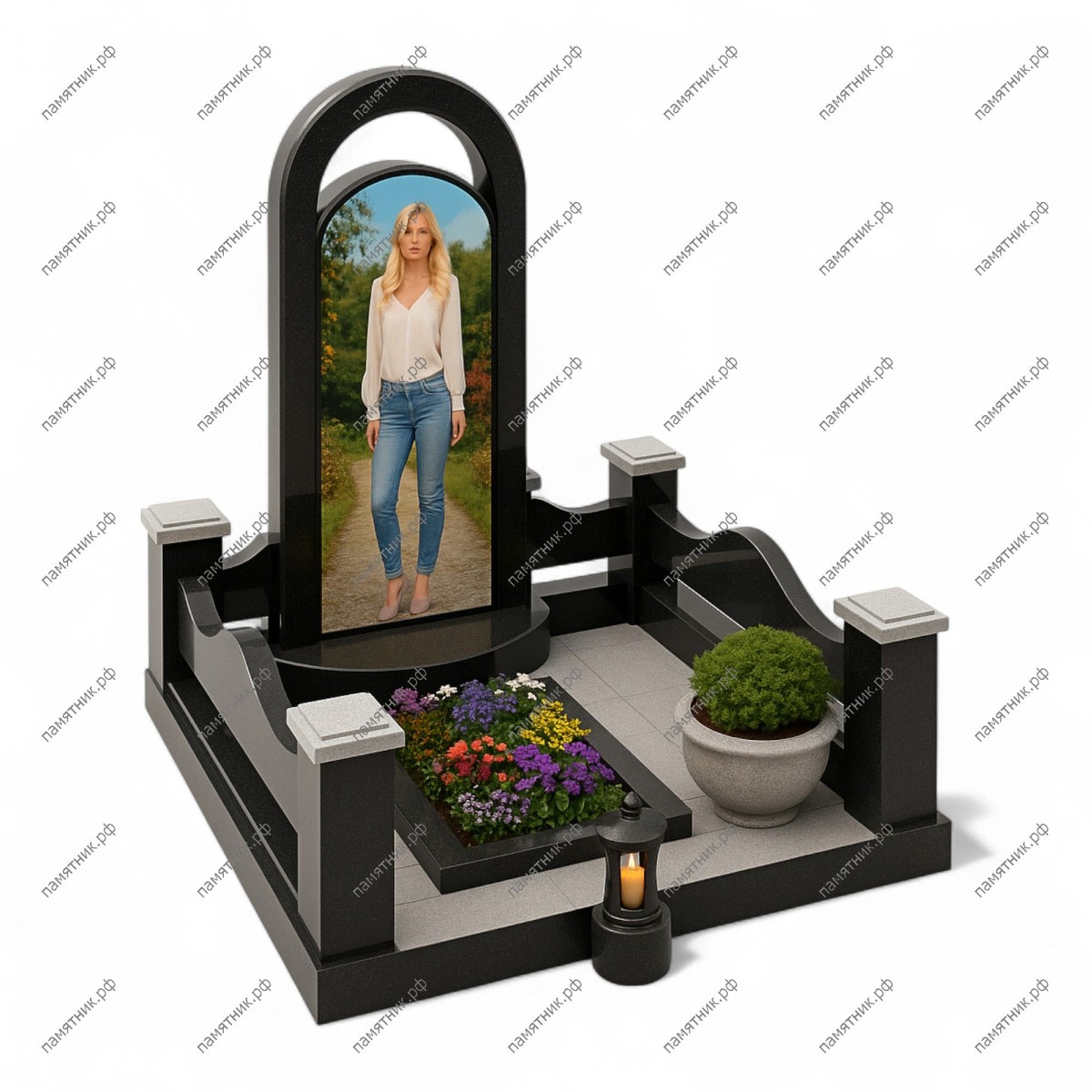 Комплектация: Монолитная арочная стела под полноростовой портрет, мощеный ступенчатый цоколь, прямоугольный цветник, ограда с серыми навершиями, гранитная лампада, каменный вазон.