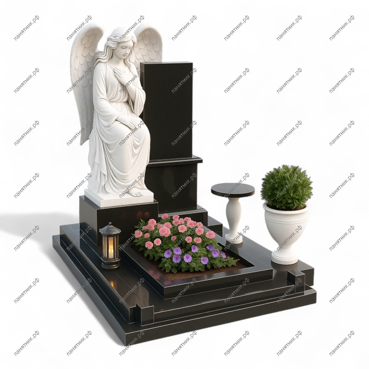 Мемориальный комплекс МК-83 построен на глубоком и трогательном контрасте. На фоне строгой многоуровневой стелы из черного полированного гранита возвышается потрясающая белоснежная скульптура скорбящего ангела. Дополняет композицию изящный круглый столик на светлой ножке.