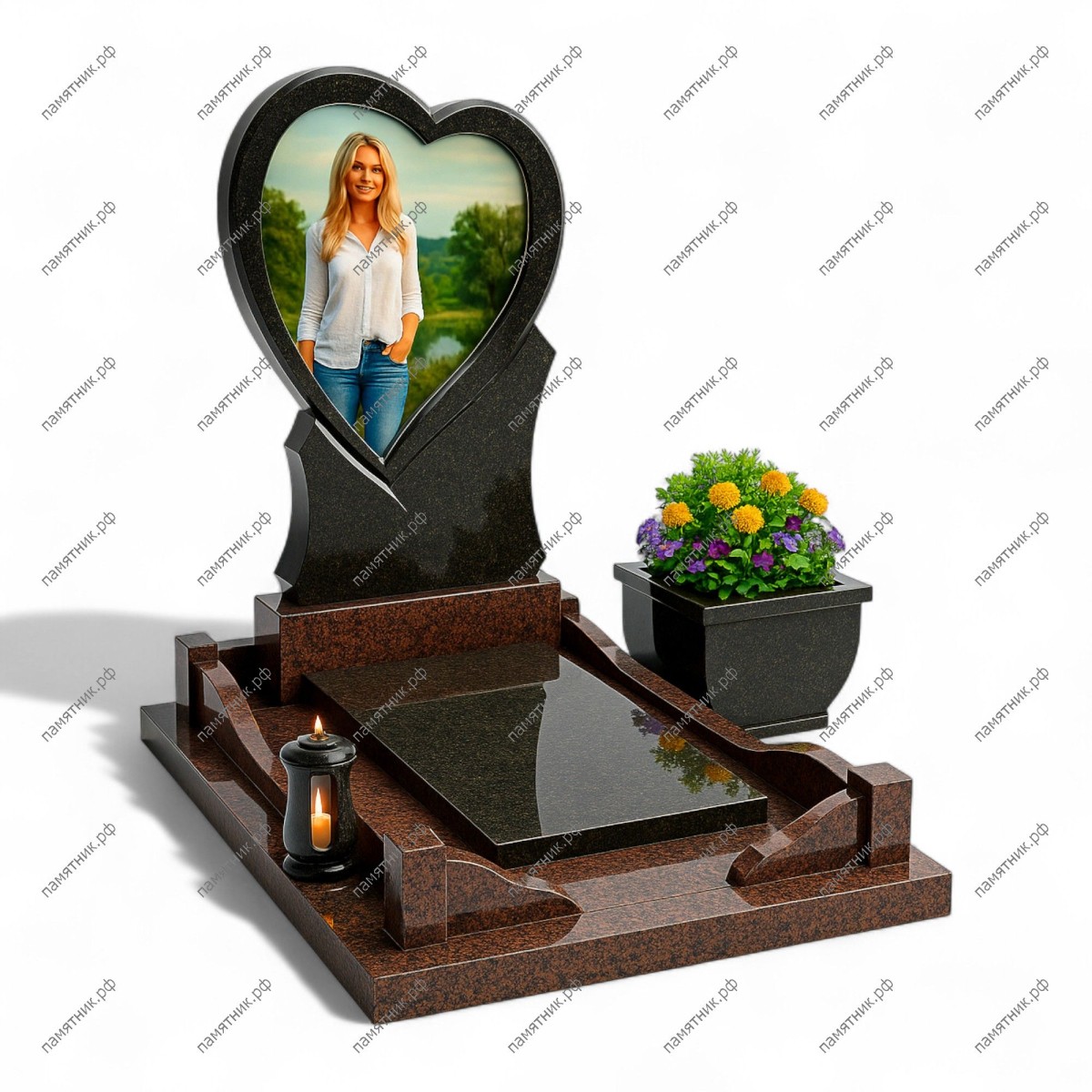 Мемориальный комплекс МК-85 — это невероятно трогательный памятник, воплощающий вечную любовь. Центральная стела из черного гранита выполнена в форме изящного сердца, которое служит рамкой для светлого портрета. Теплый коричневый гранит основания и плавные, обтекаемые линии ограды делают мемориал мягким и гармоничным.
