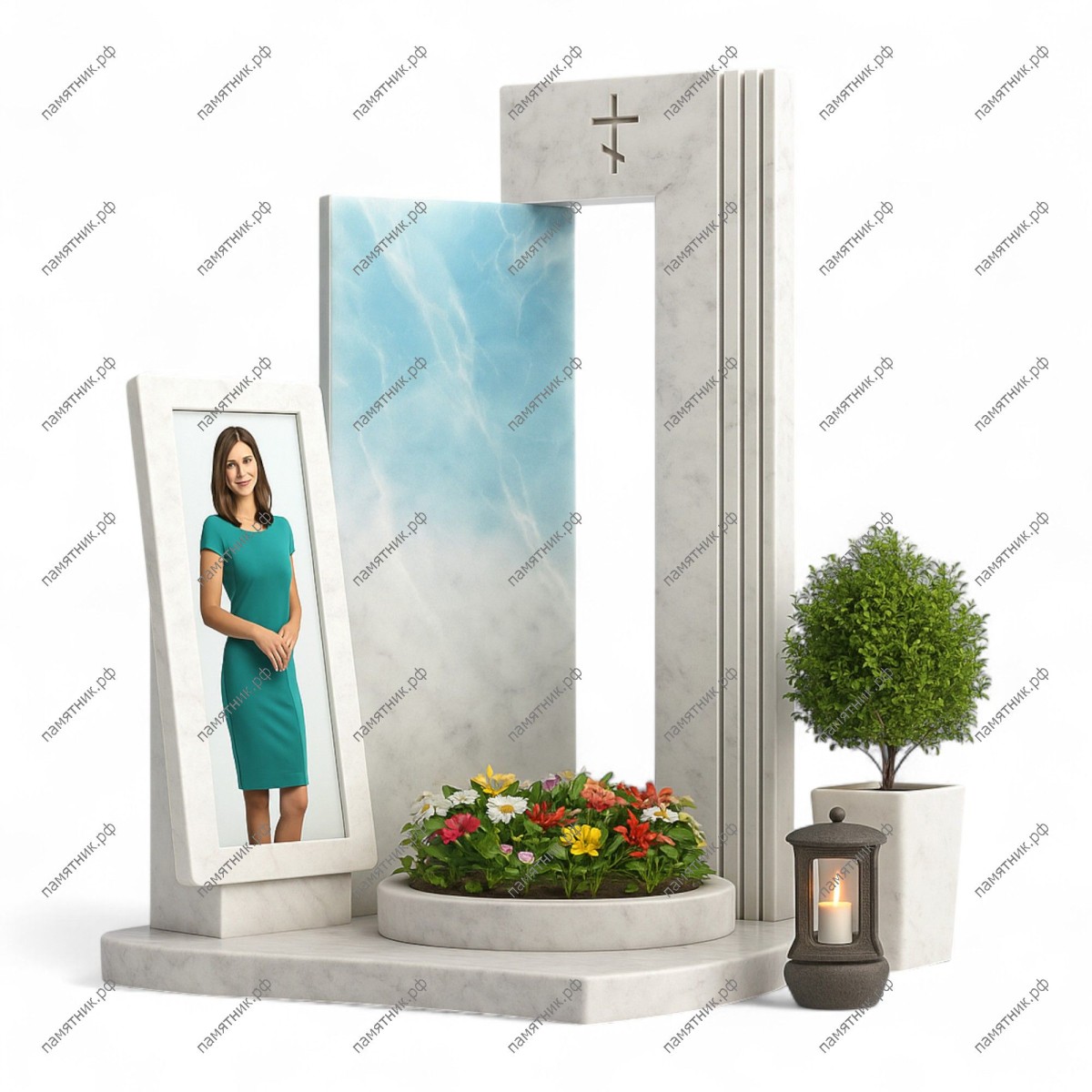 Мемориальный комплекс МК-89 выделяется ультрасовременным, асимметричным дизайном. Белоснежный мрамор формирует сложную пространственную композицию: наклонная рамка для портрета, высокая П-образная колонна со сквозным вырезом в форме креста и потрясающая задняя панель с текстурой ясного голубого неба (или воды).