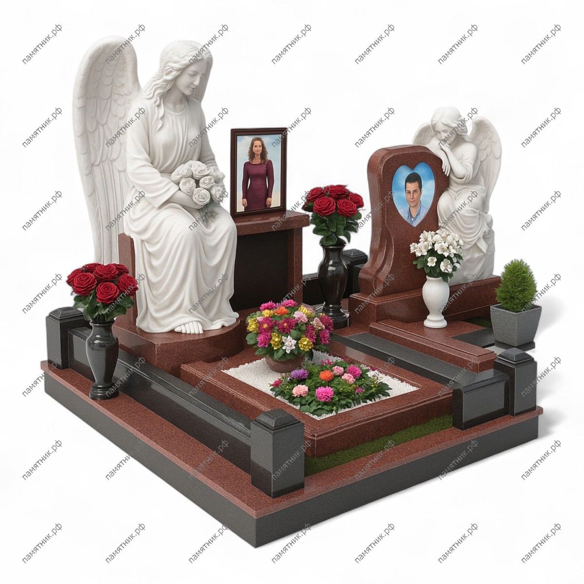 Мемориальный комплекс МК-99 — это грандиозный семейный мемориал, впечатляющий богатством скульптурного оформления. На фоне элементов из благородного красно-коричневого и черного гранита возвышаются две великолепные скульптуры из белоснежного мрамора: большой сидящий ангел и скорбящая дева, склонившаяся над стелой в форме сердца.