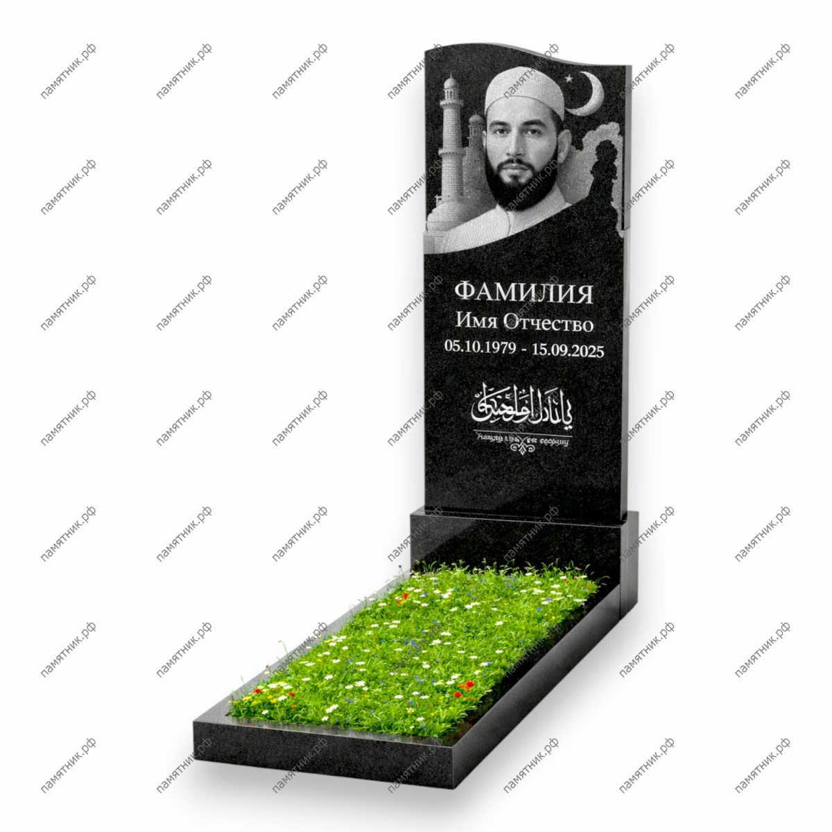 - Особенности: Верхнюю часть над портретом занимает искусная гравировка силуэта мечети, которая мягким градиентом растворяется в черном фоне камня, создавая эффект миража или утренней дымки. Справа вверху расположен полумесяц, а под датами жизни — выразительная арабская каллиграфия.