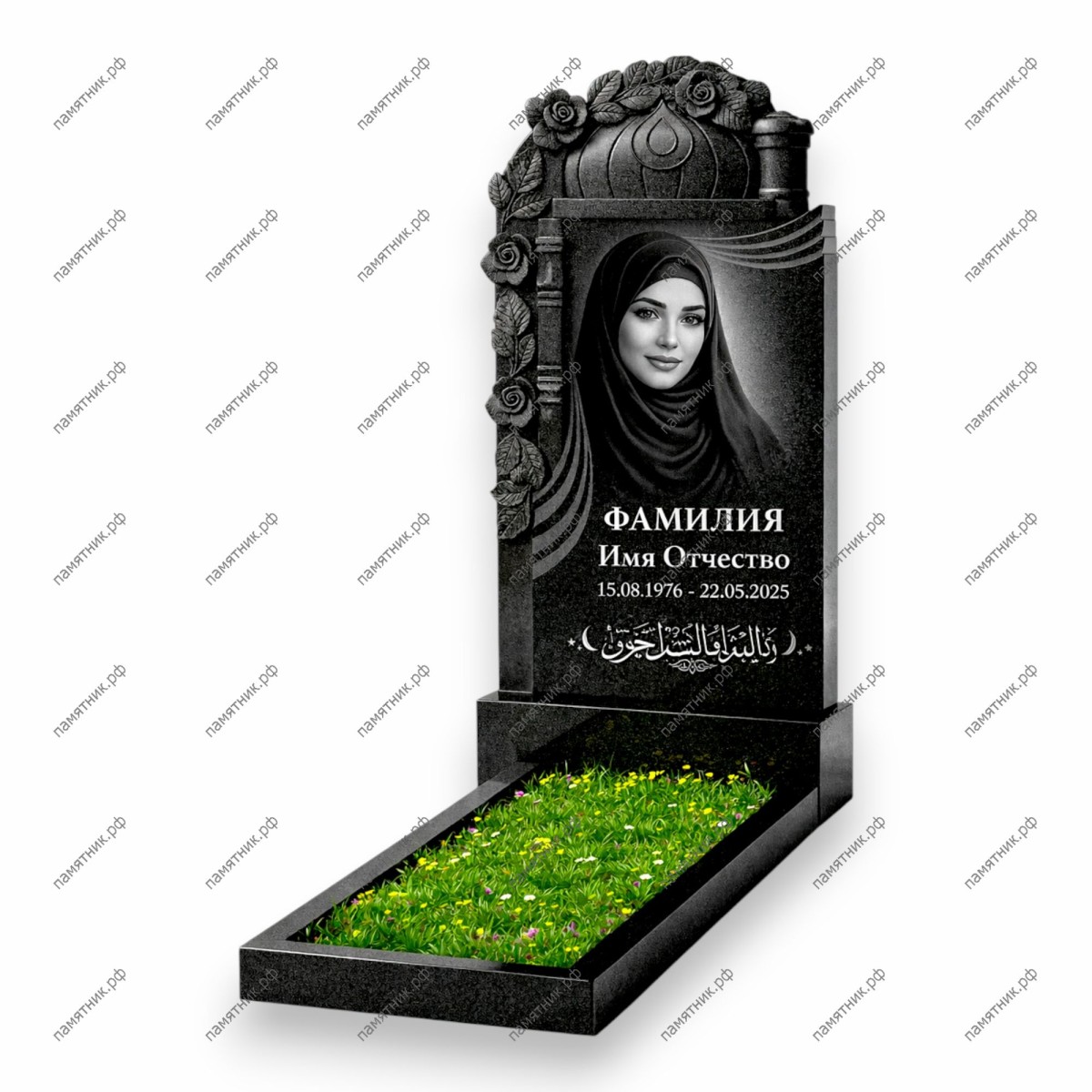- Особенности: Главное украшение модели — искусно вырезанные на левой грани объемные розы с листьями, которые плавно спускаются по стеле, символизируя райский сад. Под датами жизни расположена изящная арабская каллиграфия в декоративной виньетке.