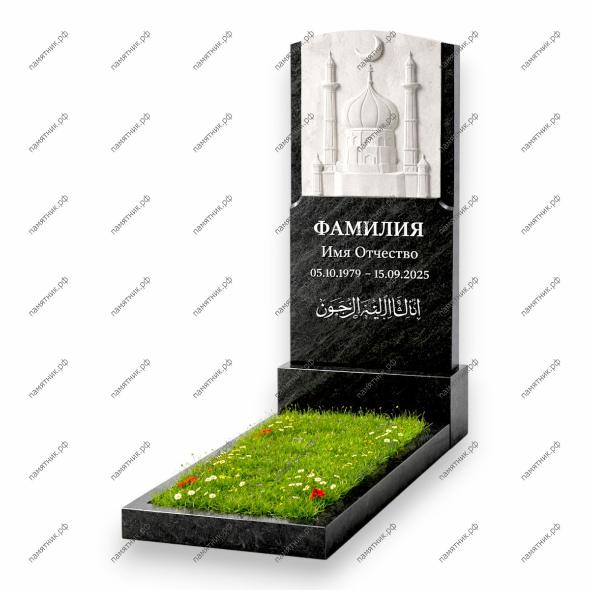 - Особенности: На светлой вставке объемно и детально вырезана композиция величественной мечети с центральным массивным куполом и четырьмя стройными минаретами. Нижняя часть из черного гранита лаконично отведена под гравировку ФИО, дат и арабской вязи.