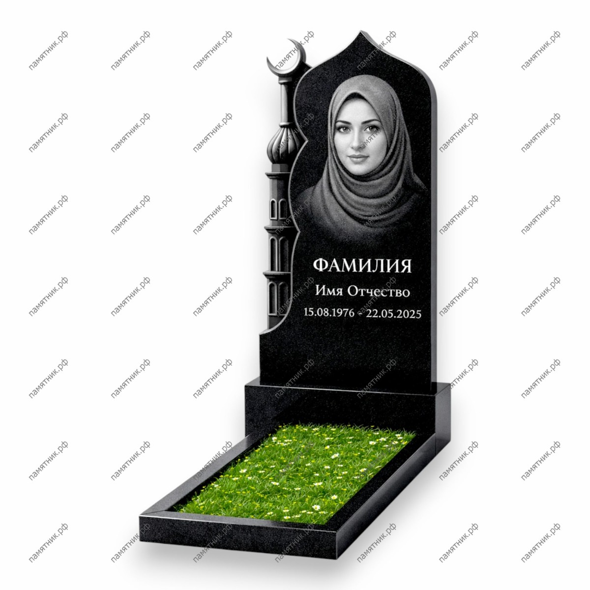 - Особенности: Левый край памятника филигранно вырезан в виде стройного, многоярусного минарета. На самой вершине минарета выгравирован или вырезан полумесяц со звездой. Модель отличается цельностью, строгостью и благородным блеском круговой полировки.