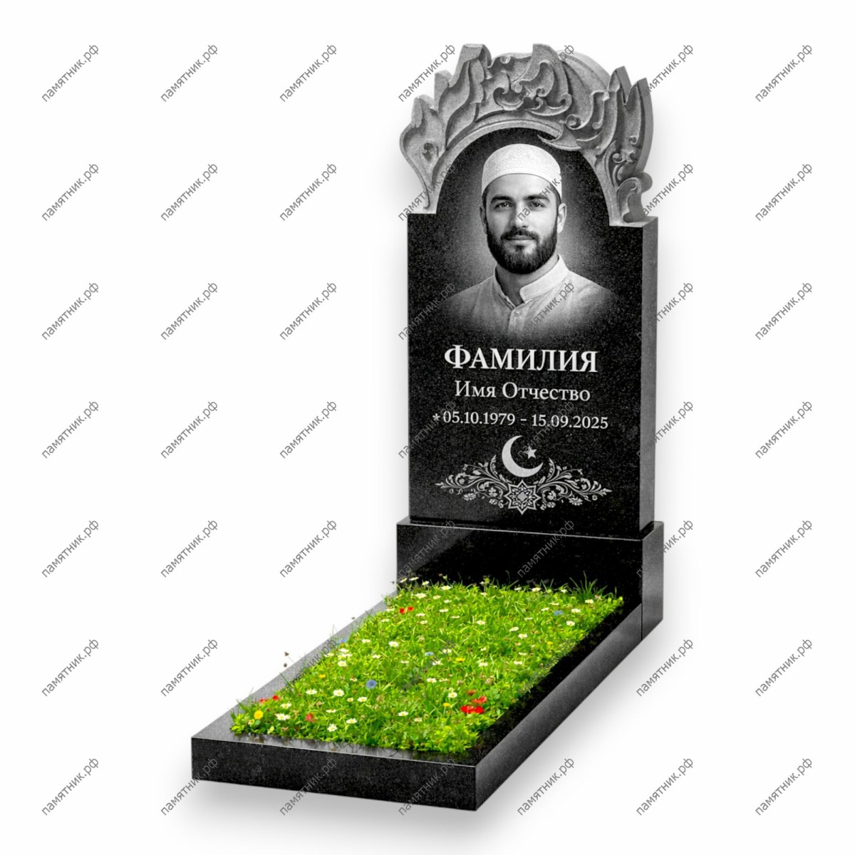 - Особенности: Светлое навершие вырезано в виде богатого объемного орнамента (арабески), изгибы которого напоминают сплетение листьев или облаков. В центре черной плиты, под основным текстом, выгравирован крупный полумесяц со звездой и растительными узорами.