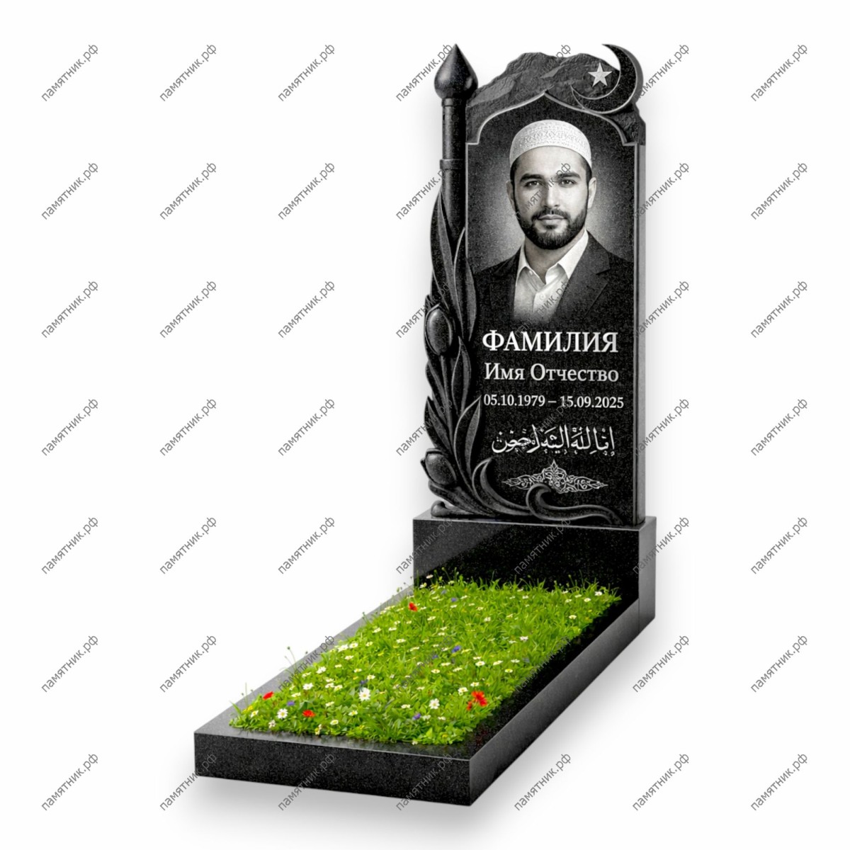 - Особенности: Левая грань стелы представляет собой искусно вырезанный минарет, который снизу и сбоку обвивают объемные листья и нераспустившиеся бутоны тюльпанов (традиционный исламский флористический символ). Правый верхний угол плавно скошен и украшен полумесяцем.