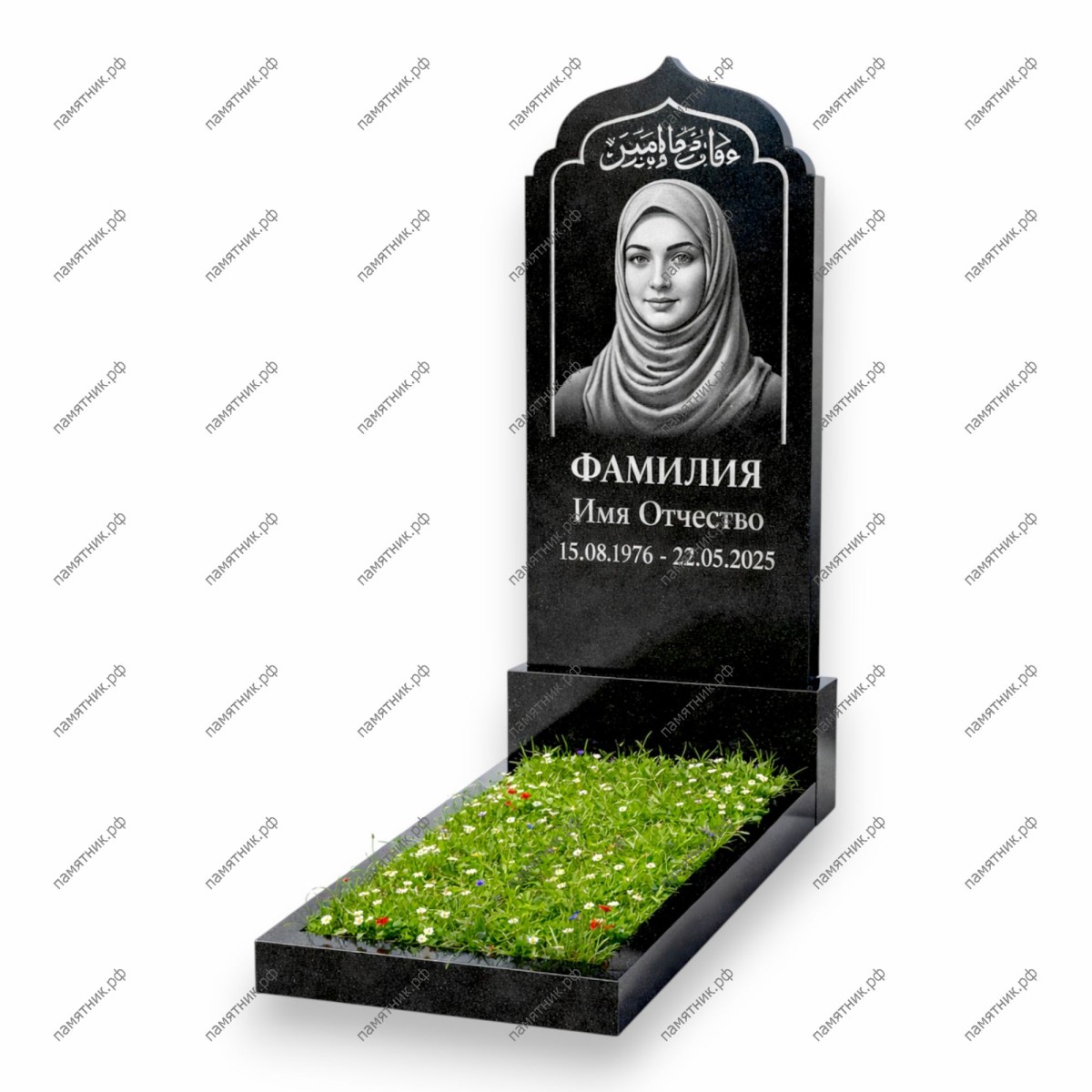 - Особенности: По периметру верхней части стелы пущена изящная светлая гравировка в виде тонкой рамки, внутри которой расположена арабская каллиграфия. Дизайн очень сдержанный, традиционный и элегантный.