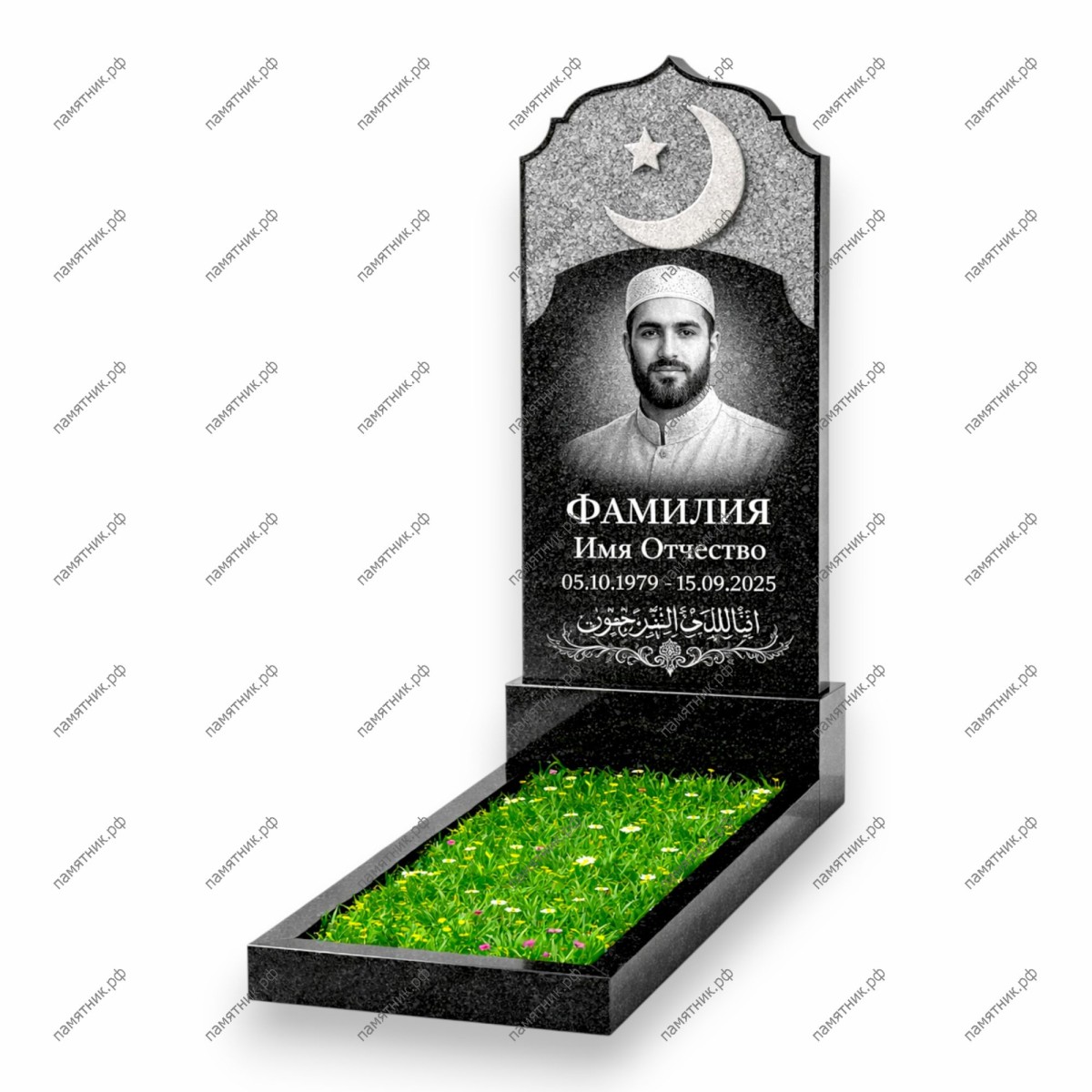 Особенности: На светлом фоне навершия расположен крупный рельефный полумесяц со звездой. Переход между материалами оформлен в виде арочного свода. Внизу памятника нанесена элегантная арабская вязь с растительными элементами.