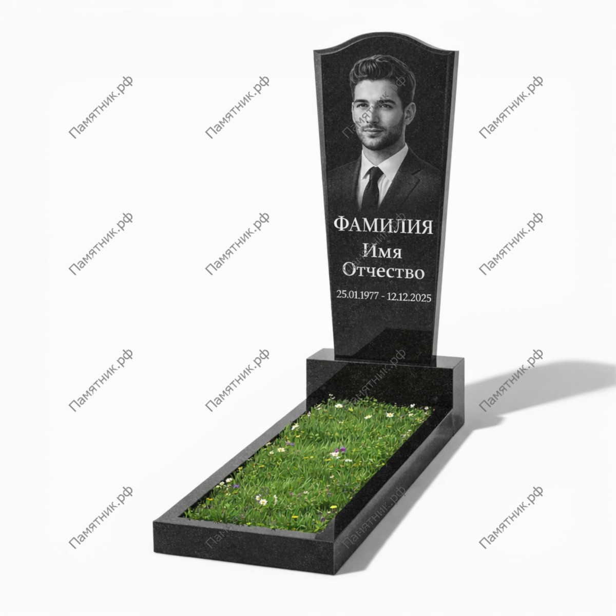 Модель выполнена из монолитного гранита Габбро-диабаз. Высокая плотность камня гарантирует, что памятник не потеряет свой насыщенный черный цвет и не покроется микротрещинами даже через 50 лет. Полированная поверхность эффектно контрастирует с матовой гравировкой портрета и надписей.