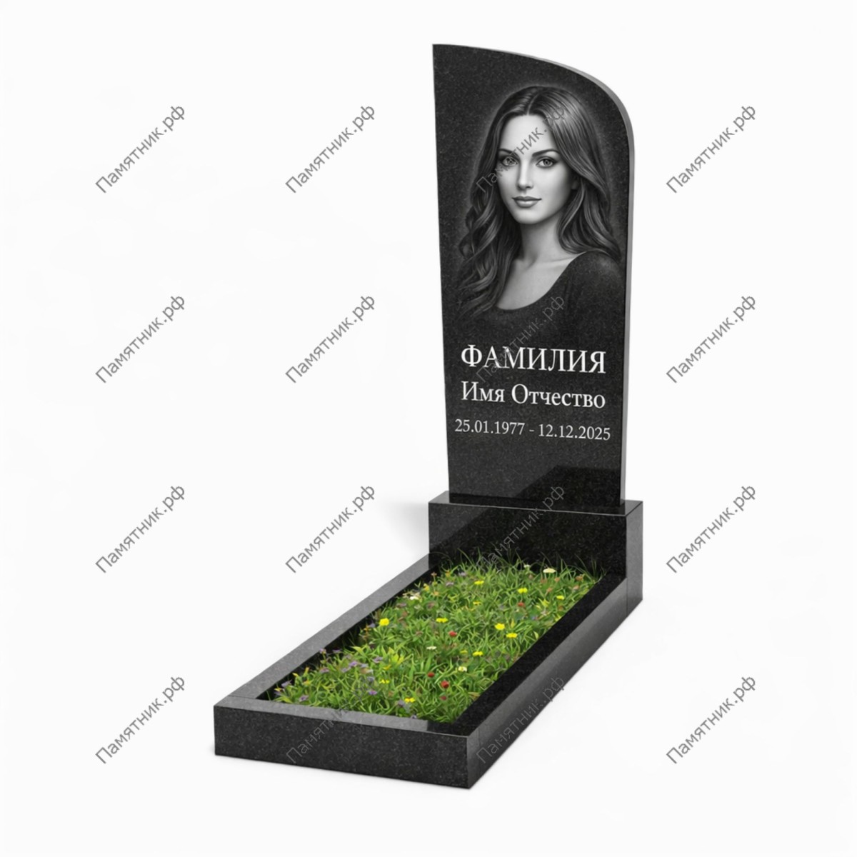 Минималистичная форма не отвлекает от главного — образа близкого человека. Широкое поле стелы позволяет разместить портрет любого размера и длинную памятную надпись. В комплекте идет стандартный открытый цветник.