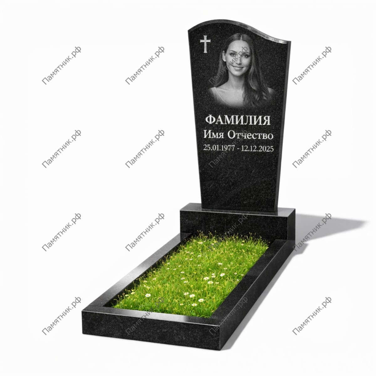Форма стелы позволяет красиво расположить небольшой крест в верхней точке, оставив центральную часть для выразительного портрета и текстовой информации. В комплект входит классический цветник из того же материала.