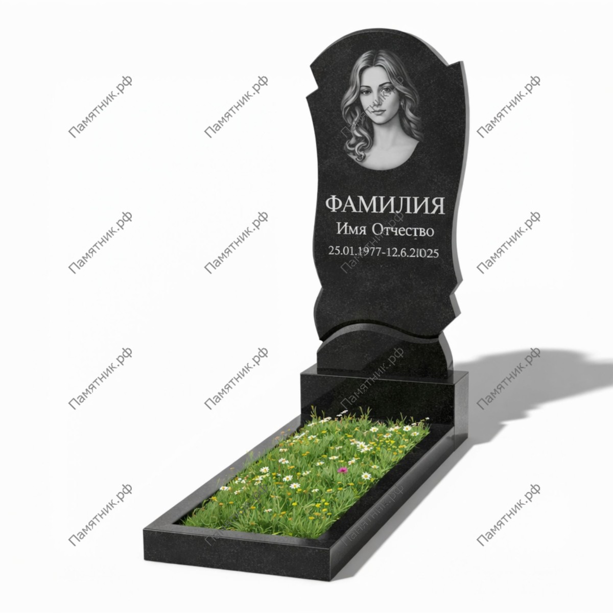 Центральная часть стелы специально спроектирована для размещения крупного портрета, который будет эффектно выделяться на фоне сложной огранки камня. В комплект включен классический открытый цветник.