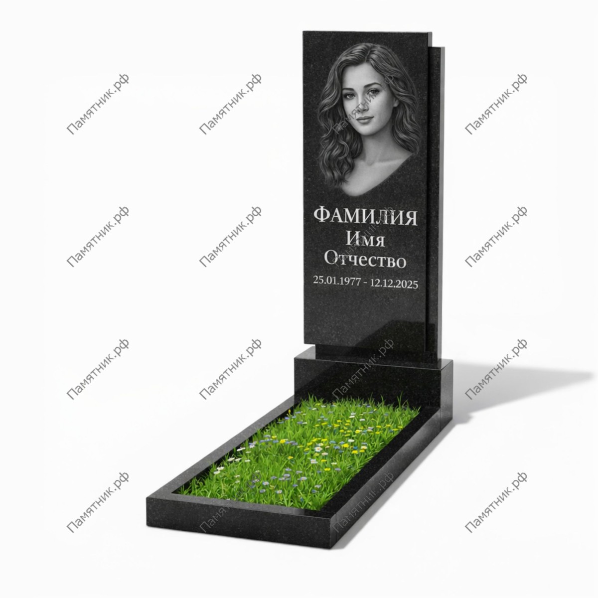Большая ровная площадь стелы — идеальное пространство для крупного портрета и детальной гравировки. Модель дополняется массивной тумбой и классическим гранитным цветником.