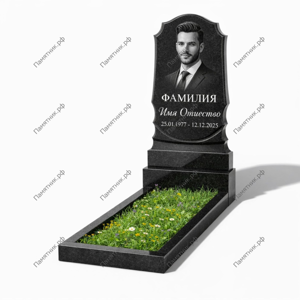 Широкое поле стелы обеспечивает максимум возможностей для художественного оформления: от поясных портретов до сложных пейзажных гравировок на обратной стороне. В стоимость включен цветник.